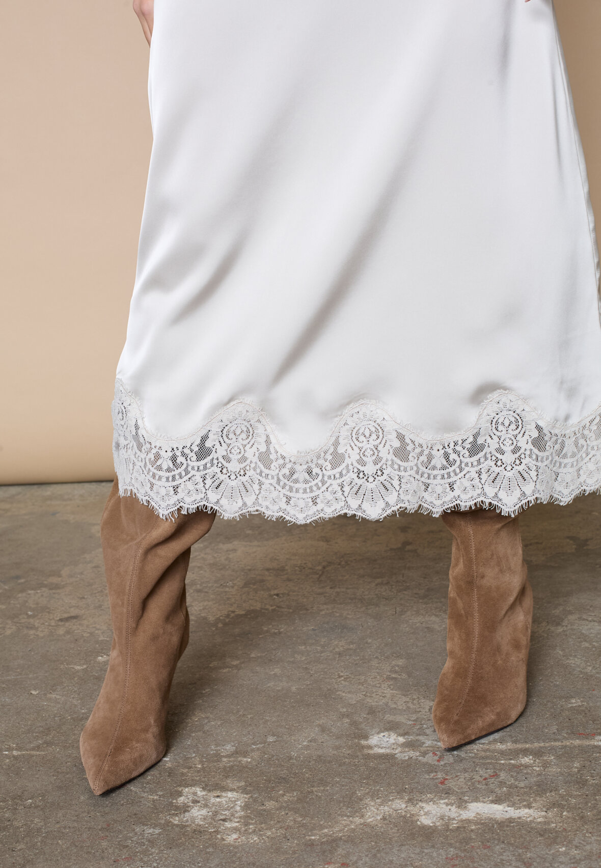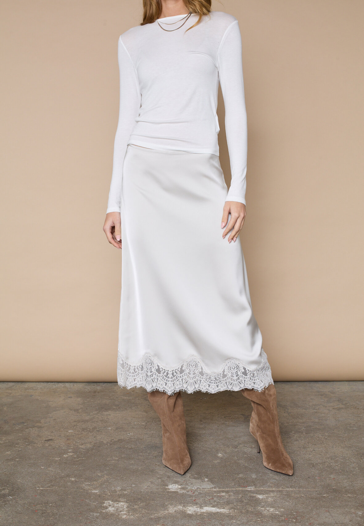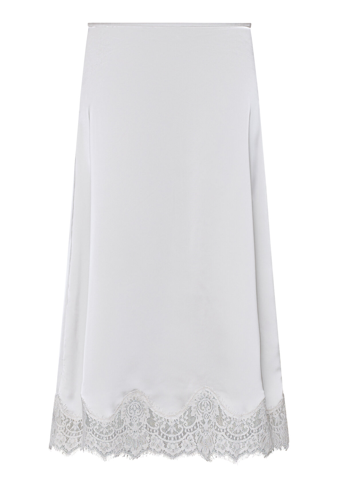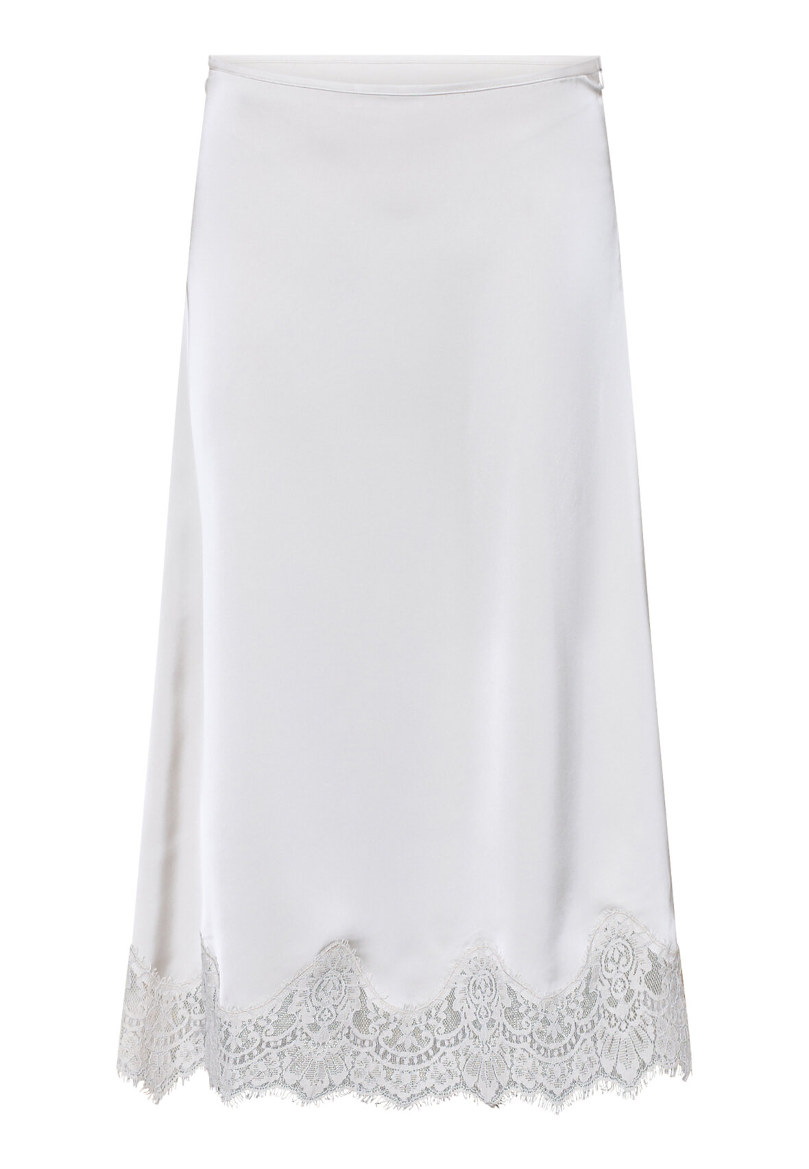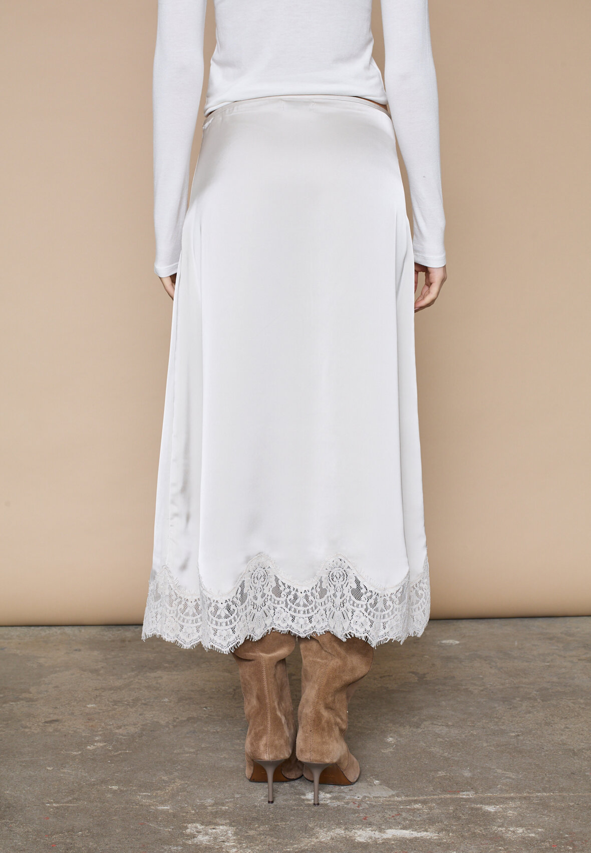love1503 is an elegant midi skirt in silky satin, featuring a sophisticated bias cut that creates a beautiful fall. Detailed with a luxurious lace edge for a feminine lingerie look. The model is wearing a size S.