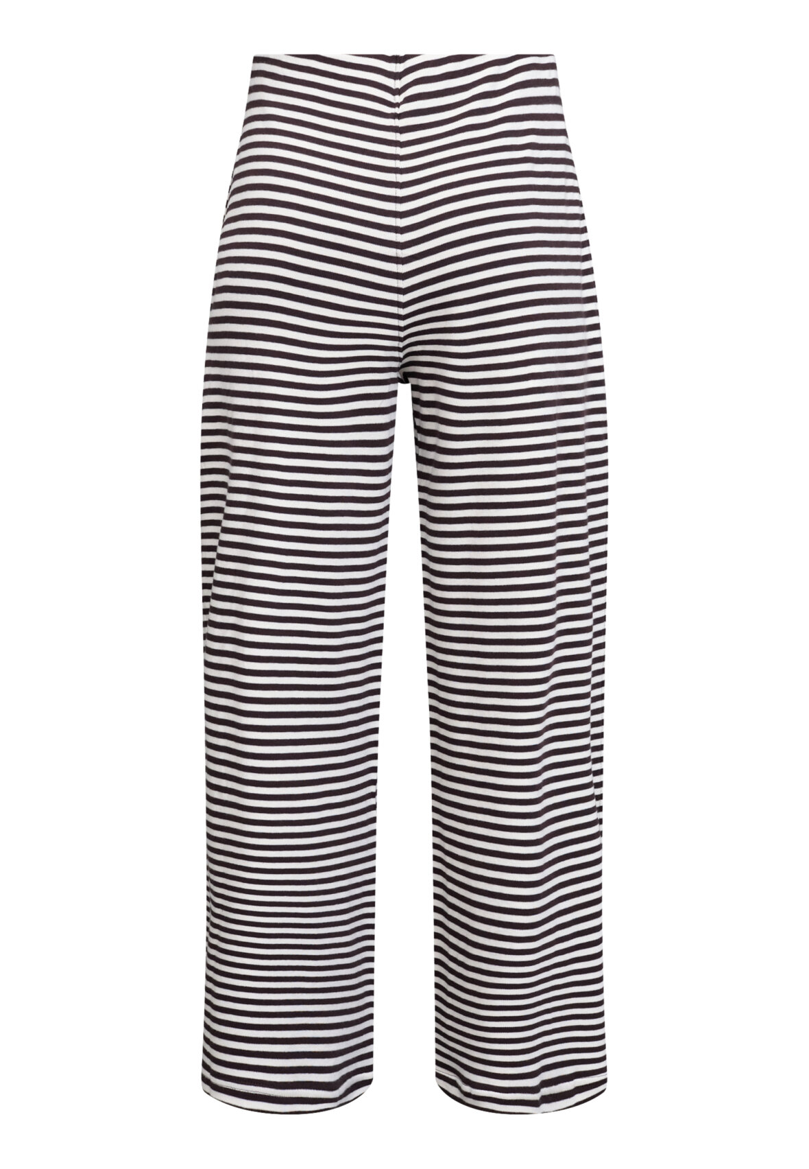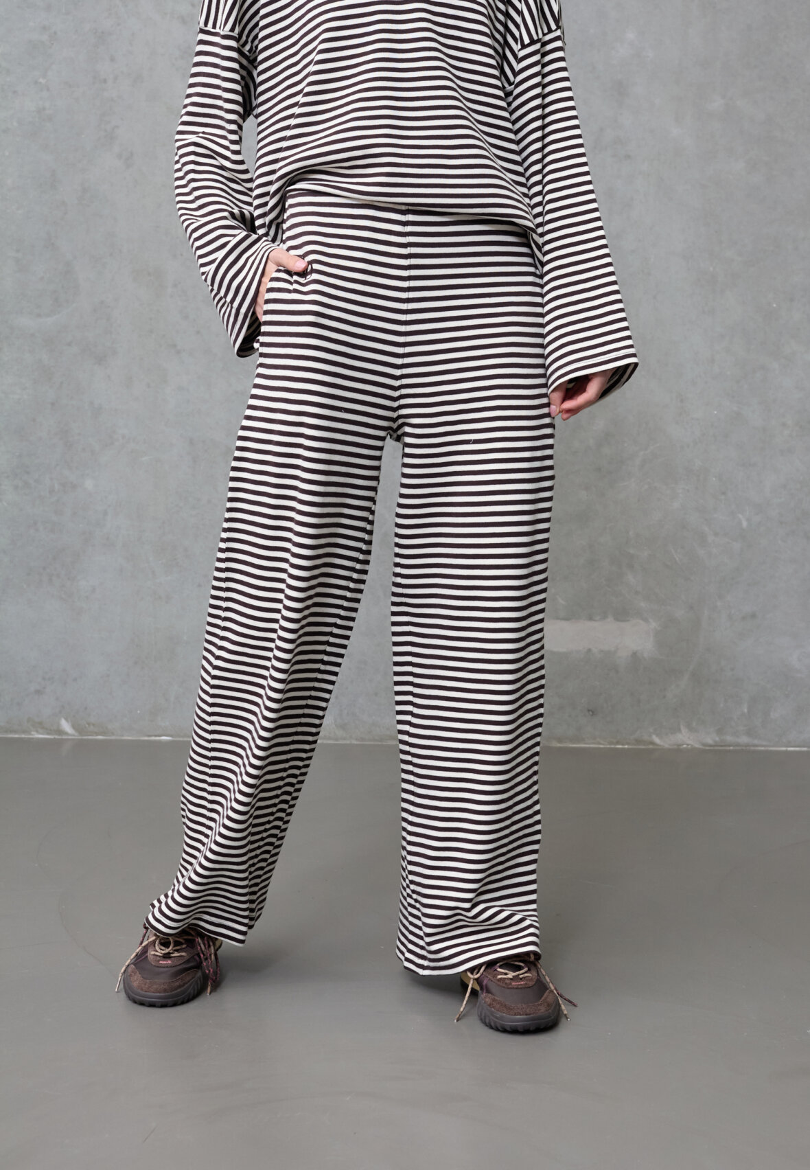 love1506 is a wide-leg trouser. The trousers have a loose fit, elastic waistband and side pockets. It has a timeless striped print and an embroidered logo at the pocket. The model is wearing a size S and is 171 cm tall.