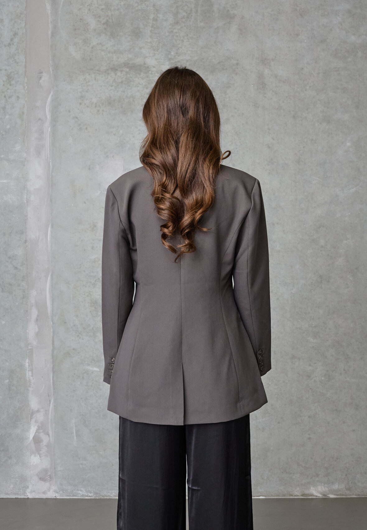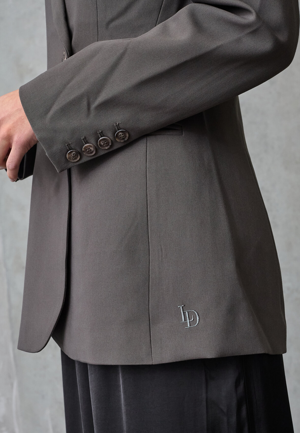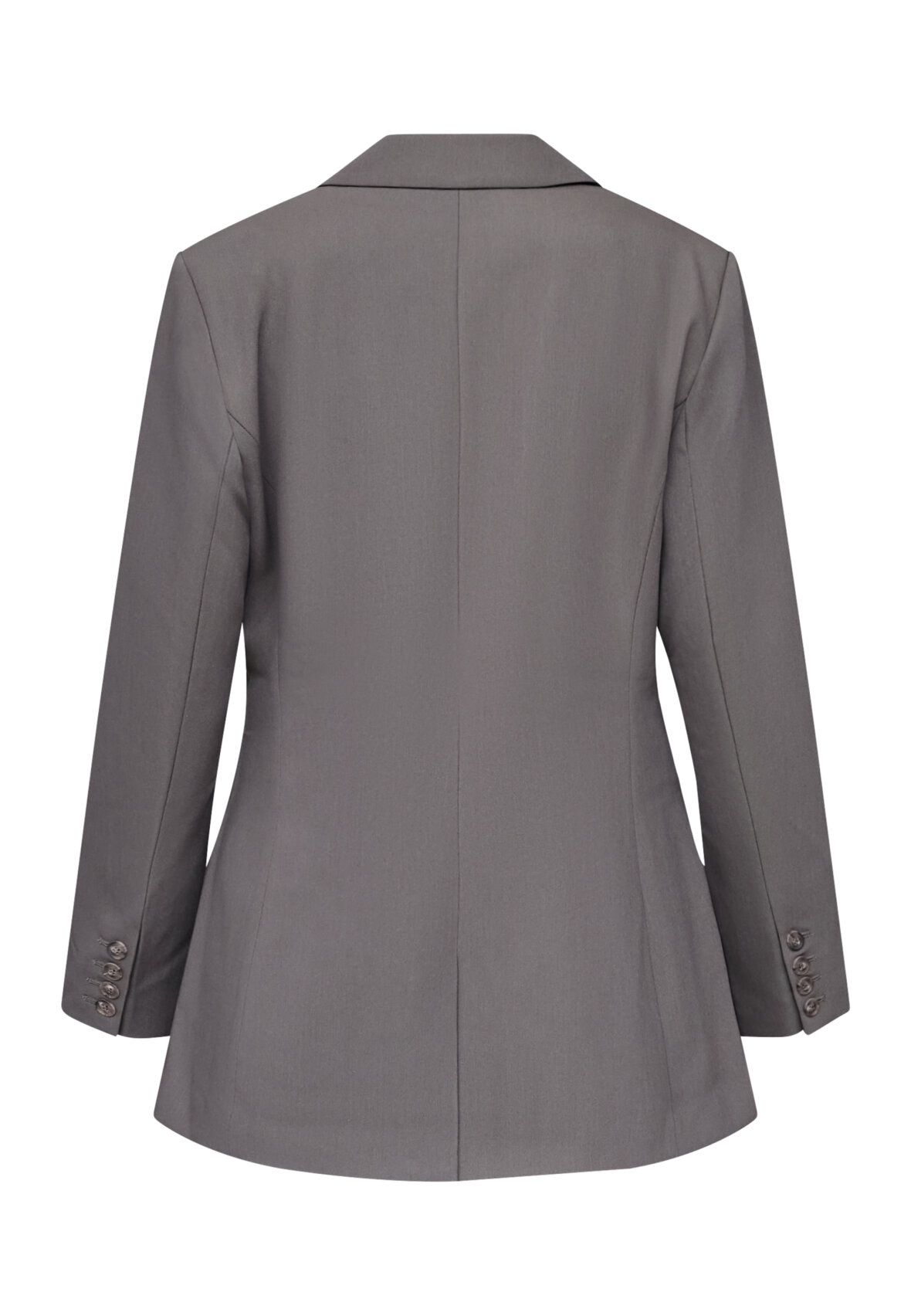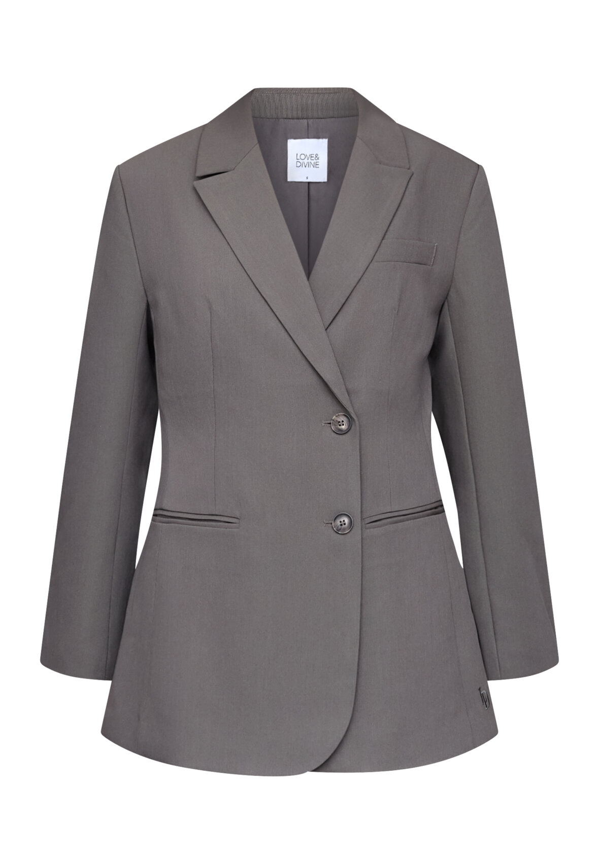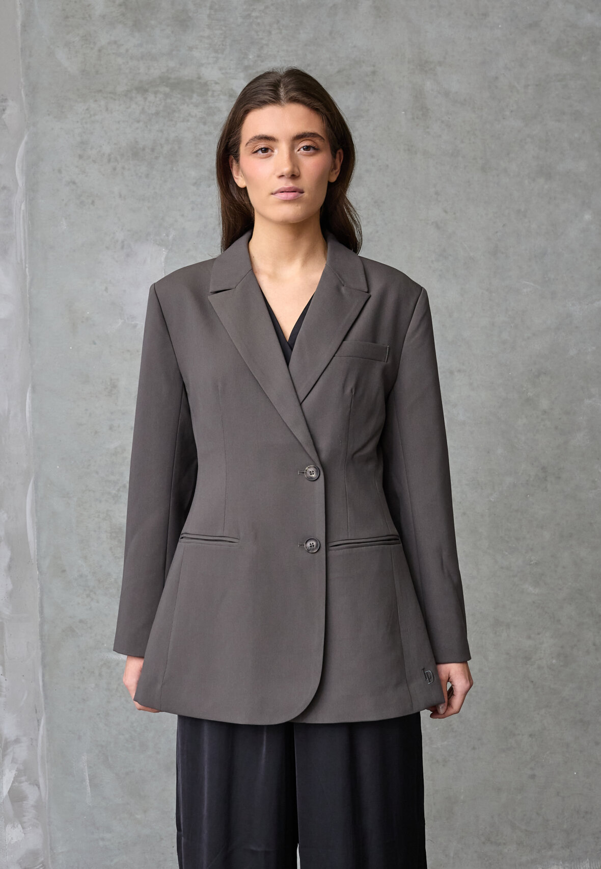 love1494 is a blazer with a structured silhouette, pronounced shoulders and classic lapels. This menswear-inspired style features a single button closure and welt pockets. The model is wearing a size S.