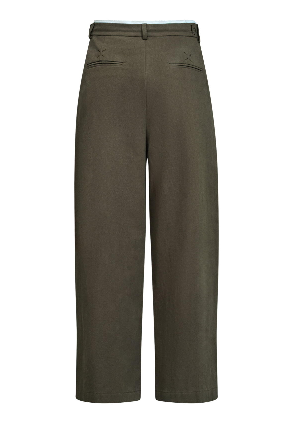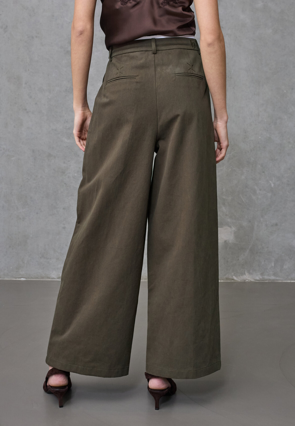 love1511 a pair of trousers in a thick woven material with a high-waist fit. The design has pleats, a practical drawstring at the waist and embroidered details on the back pockets. The model is wearing a size S and is 175 cm tall.