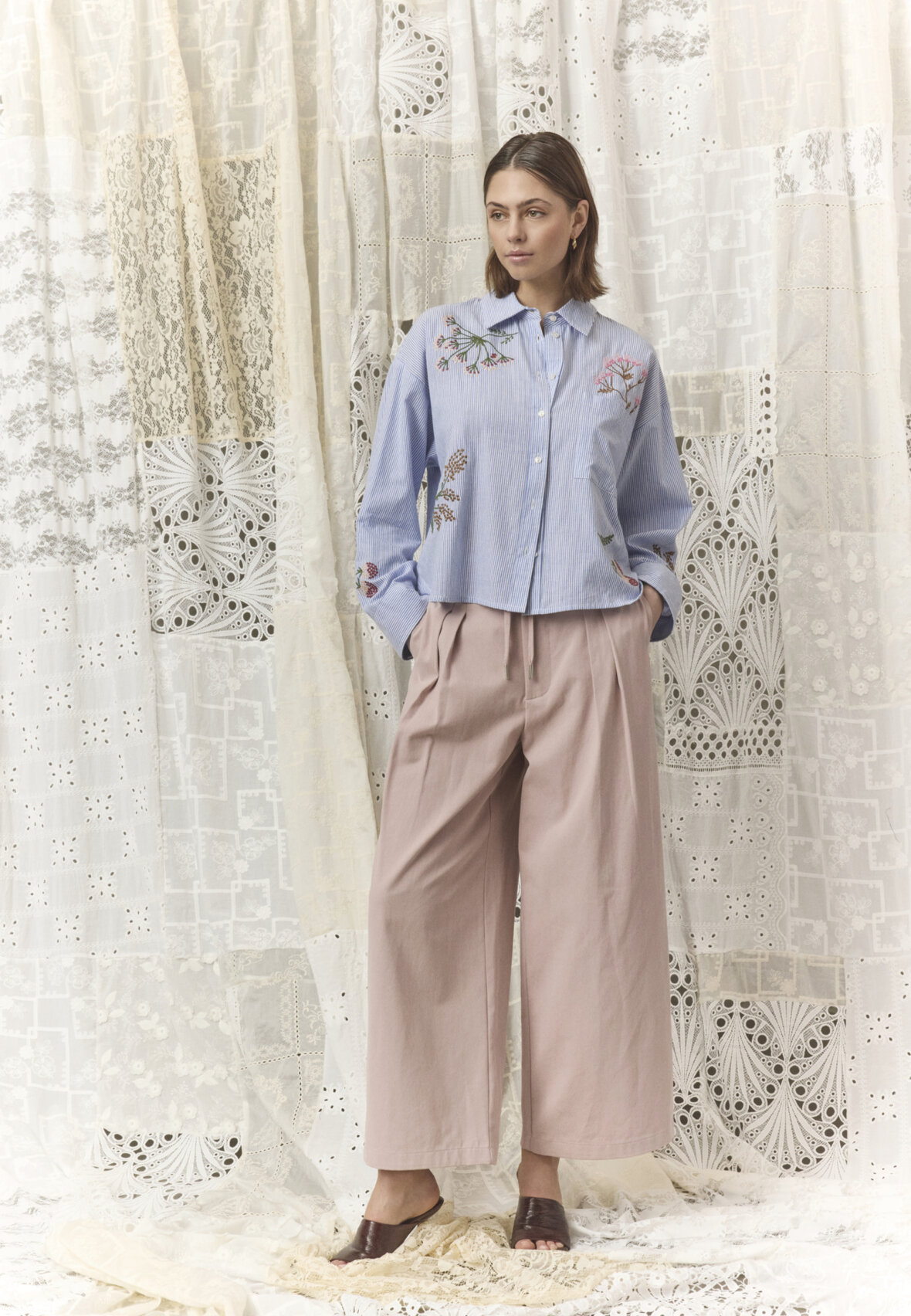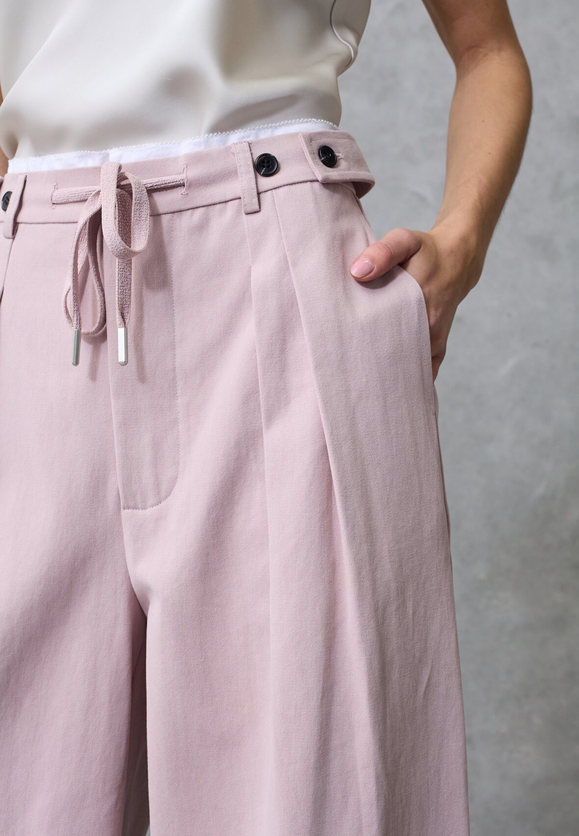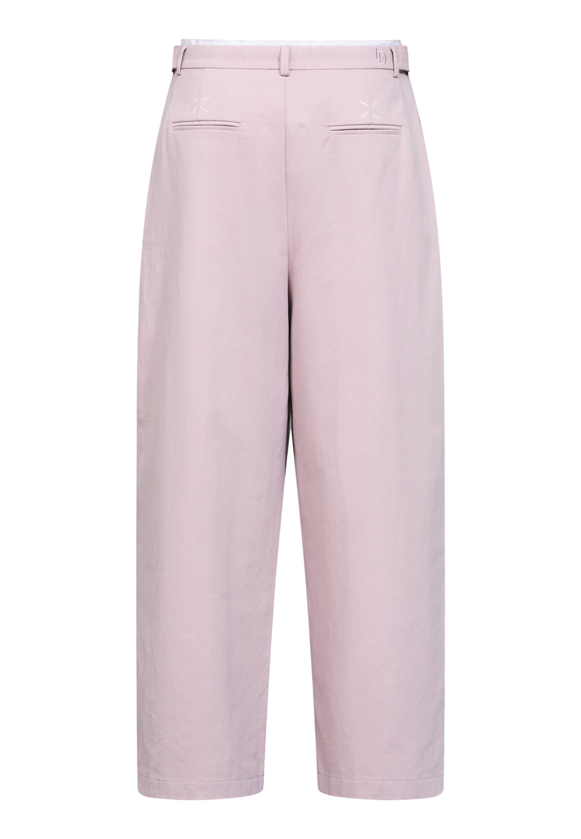 love1511 a pair of trousers in a thick woven material with a high-waist fit. The design has pleats, a practical drawstring at the waist and embroidered details on the back pockets. The model is wearing a size S and is 175 cm tall.