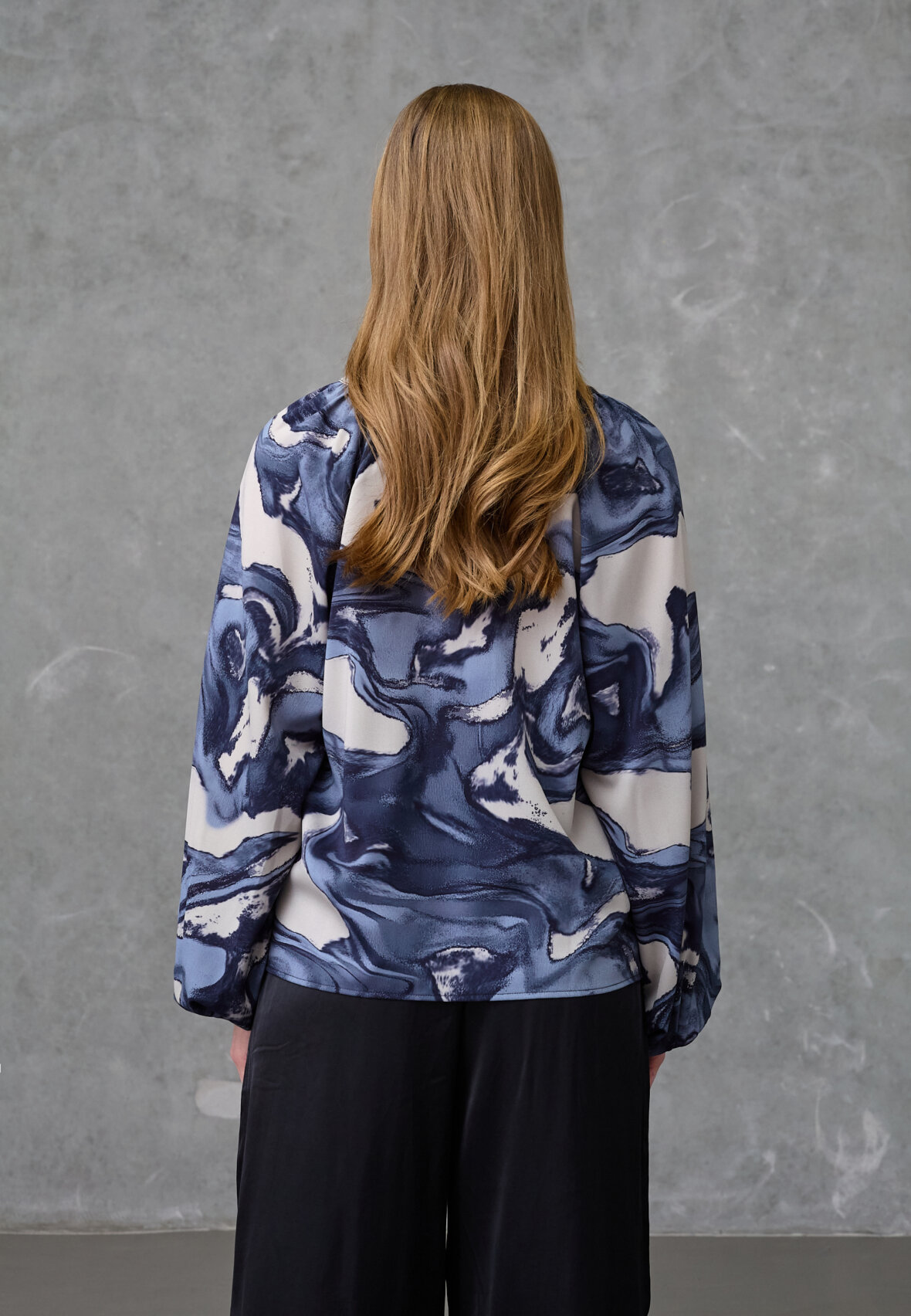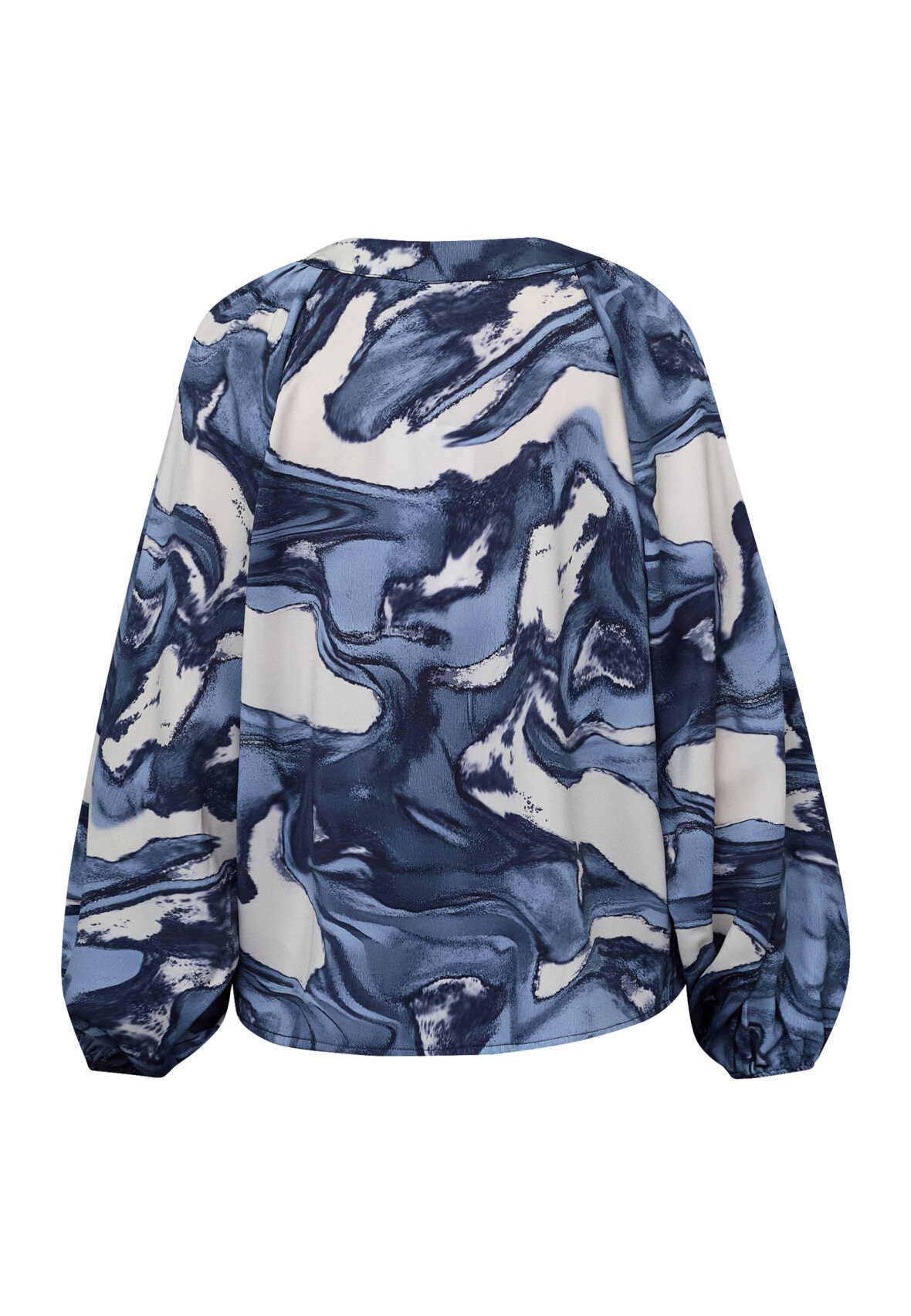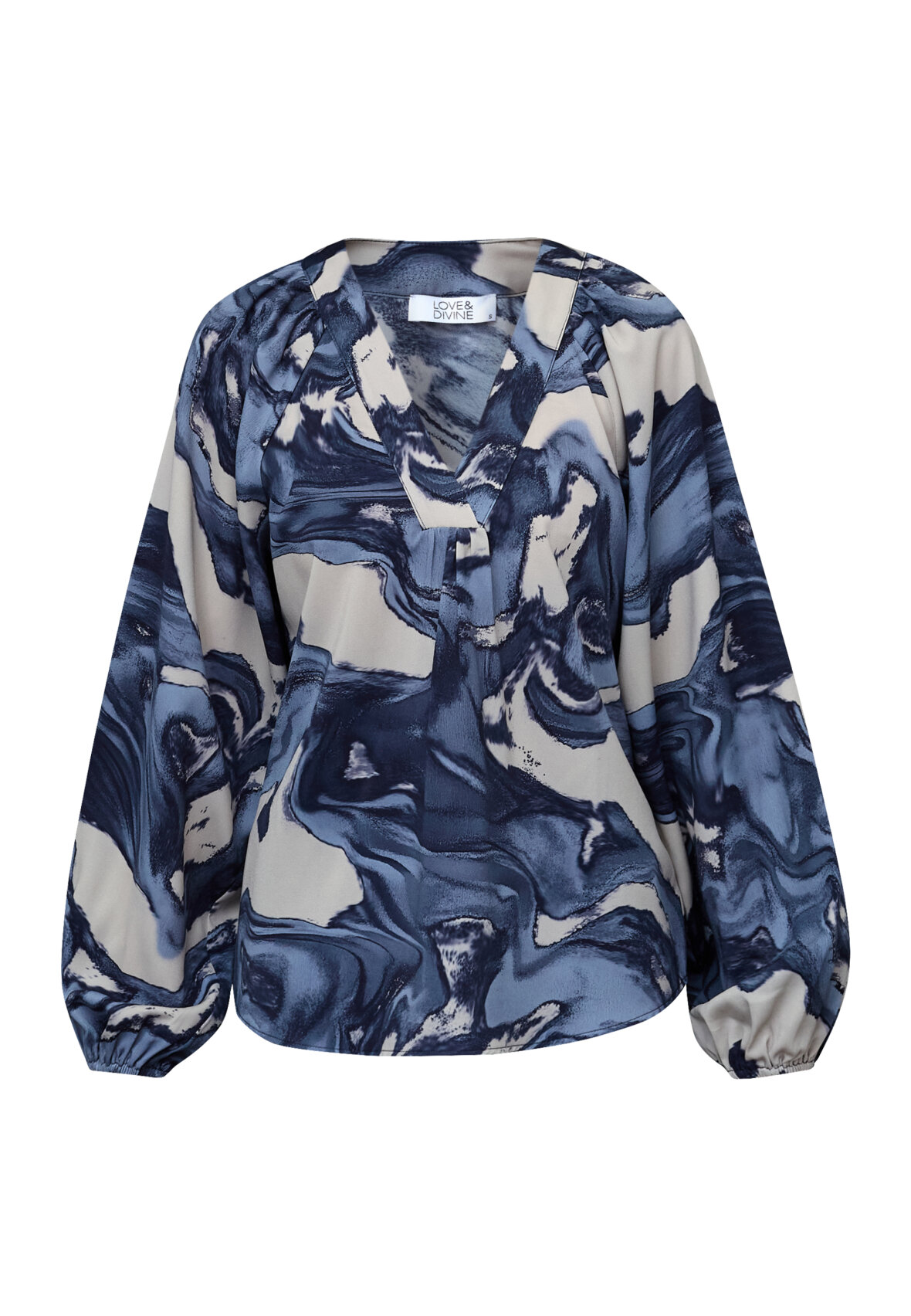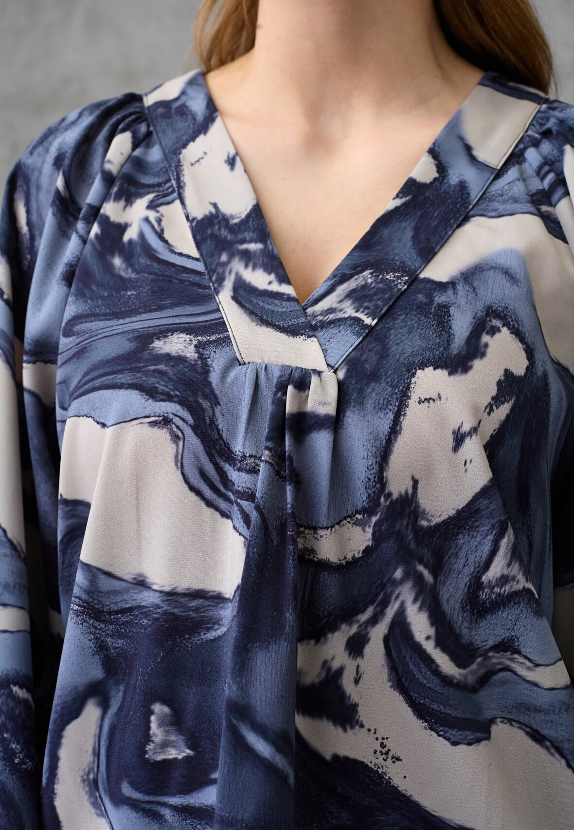 love1529-1 is an elegant blouse in a marbled print with an oversized fit. The design has a feminine V-neck with fine pleats and voluminous balloon sleeves. The model is wearing a size S.