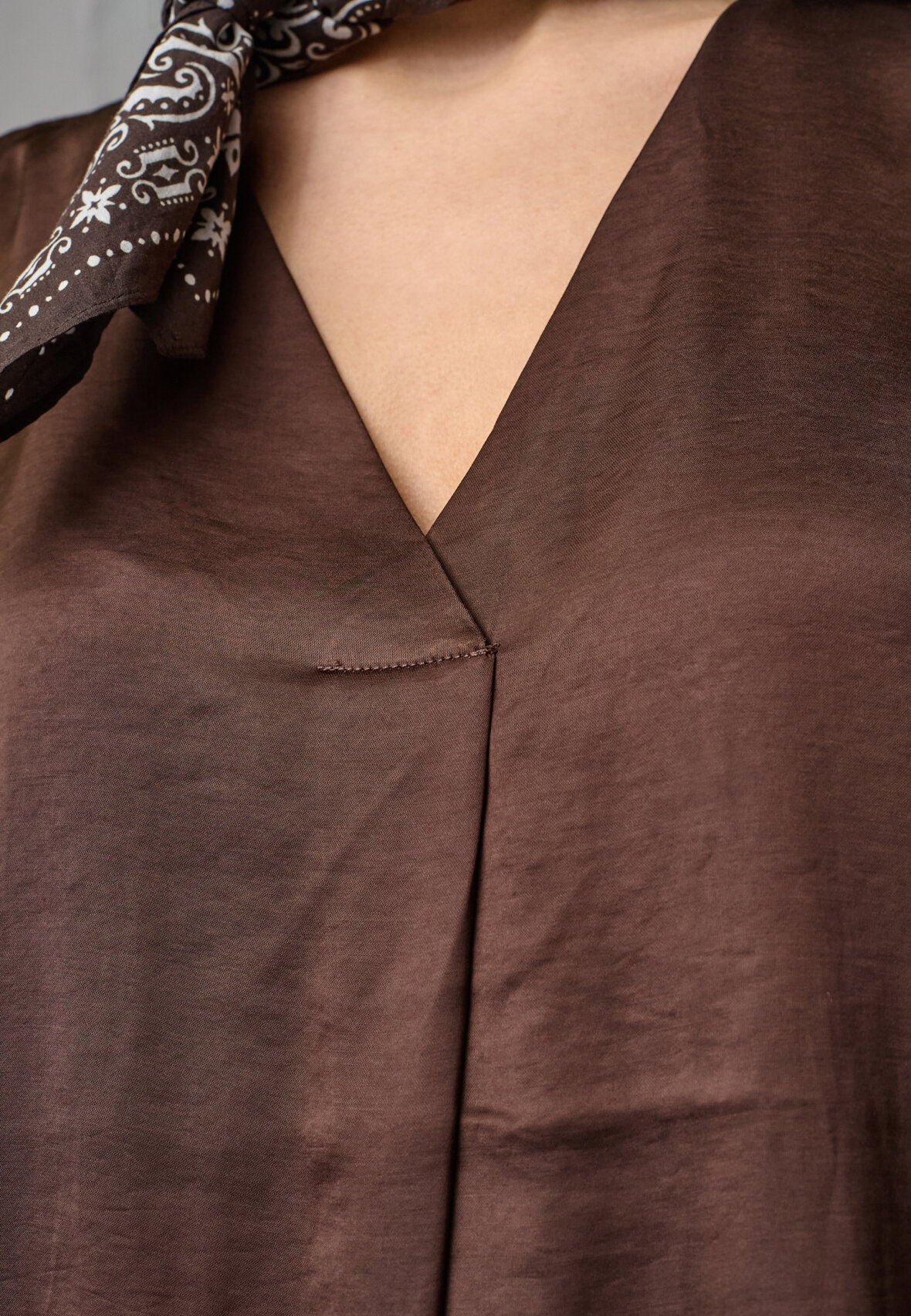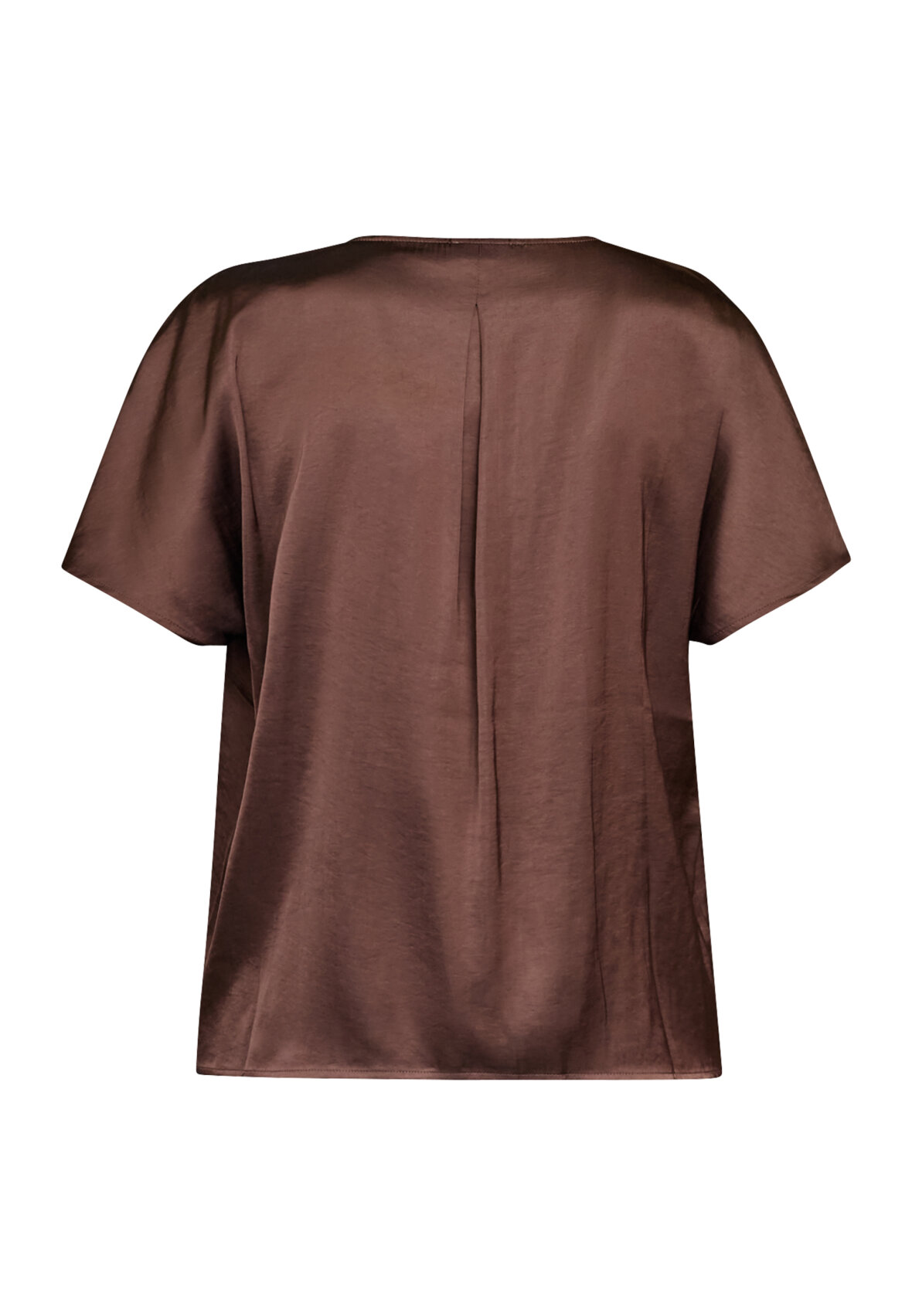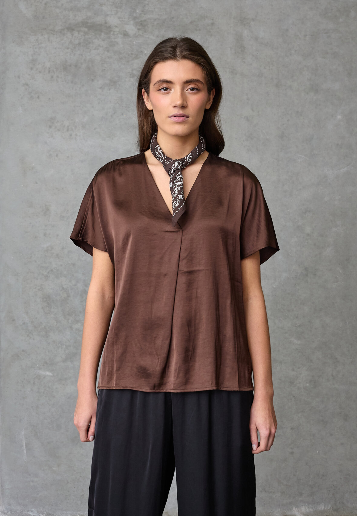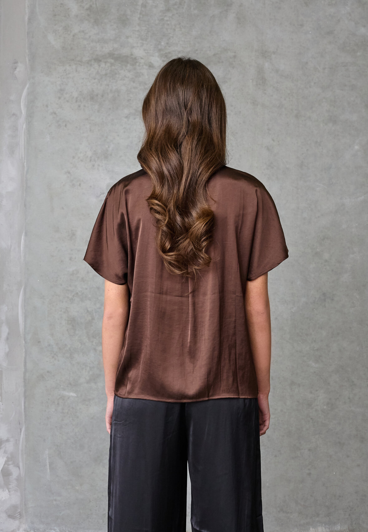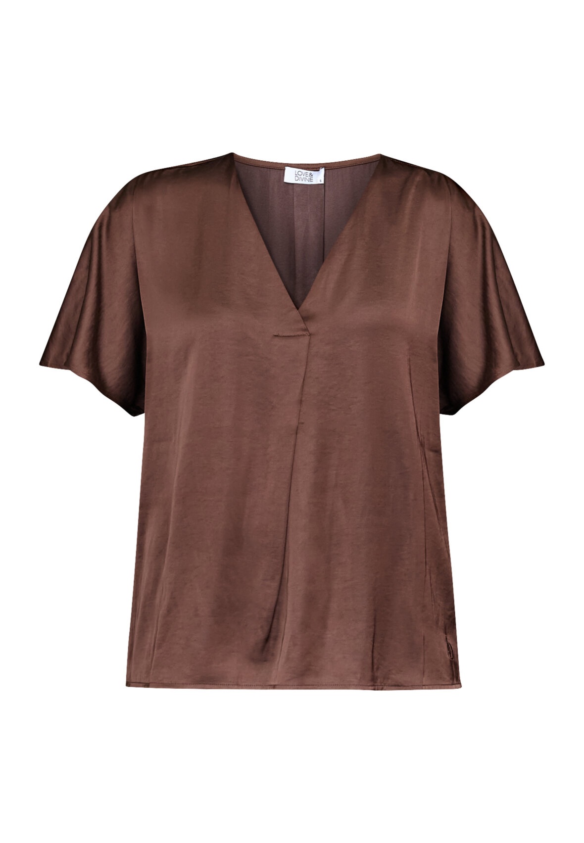 love1514 is an elegant satin look blouse with a v-neck, short sleeves and a relaxed fit. The model is wearing a size S.