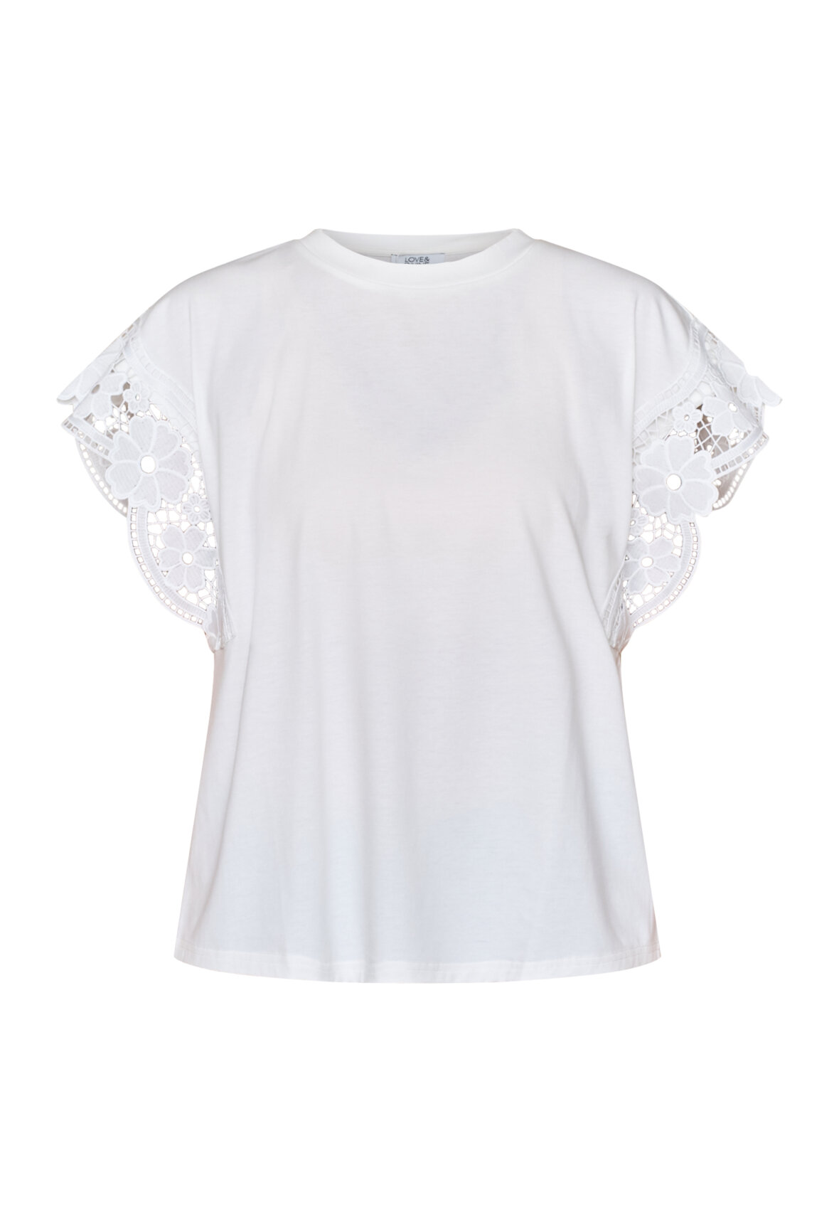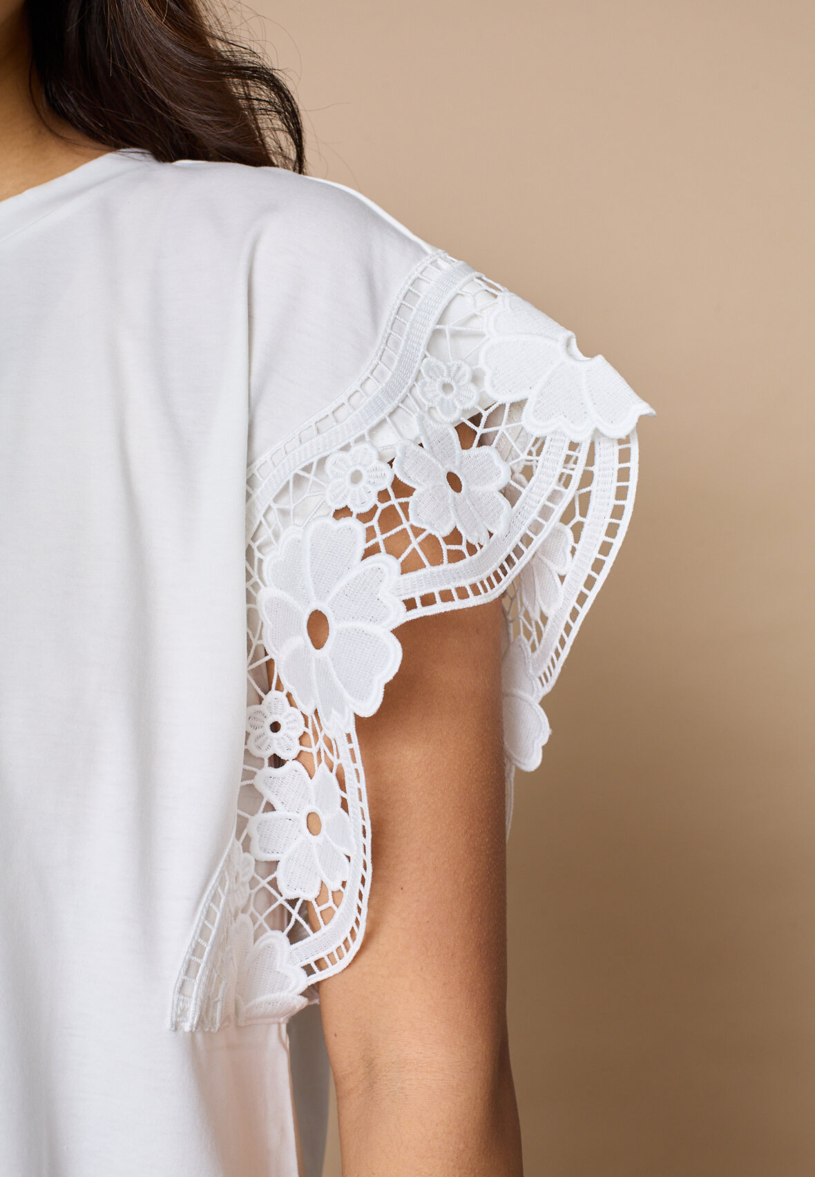 love1517 is a feminine T-shirt with a luxurious twist through the beautiful broderie anglaise sleeves. The blouse has a classic regular fit, round neck and decorative ruffled edges with floral lace. The model is wearing a size S.