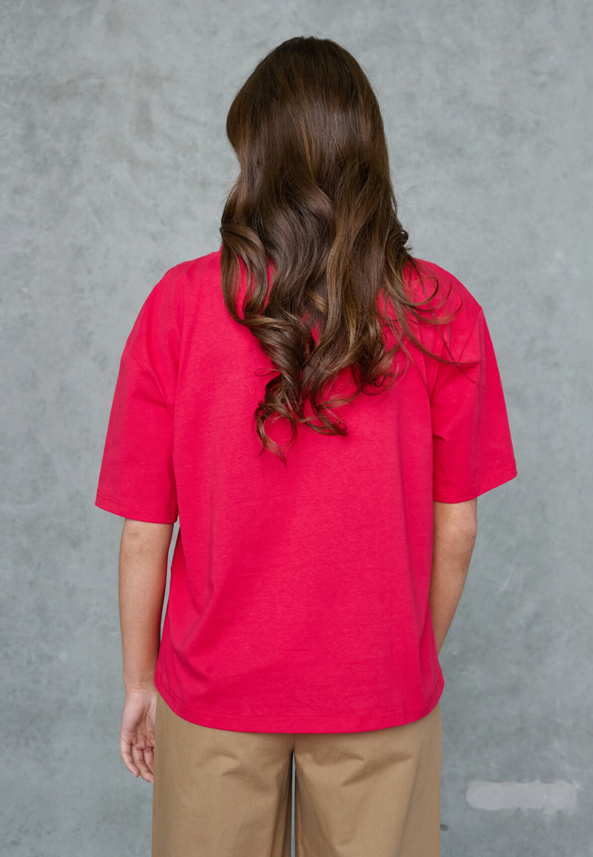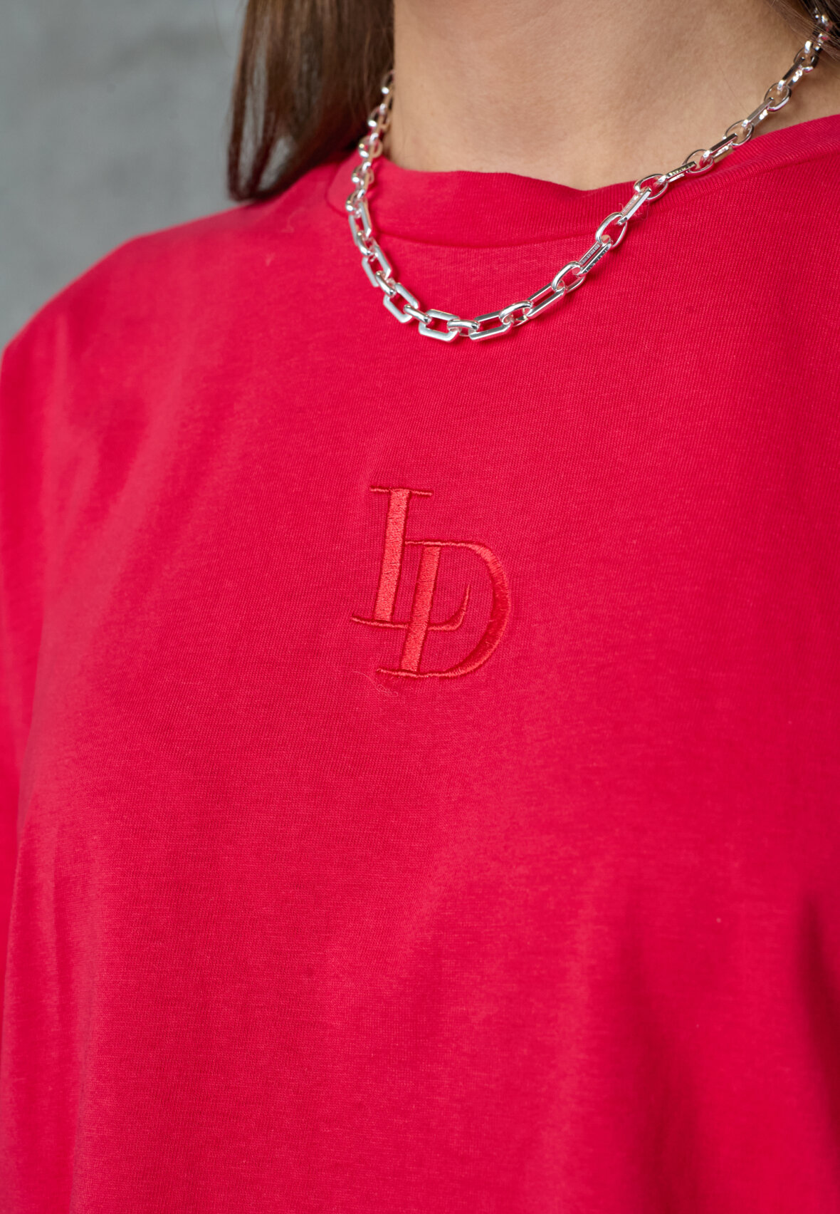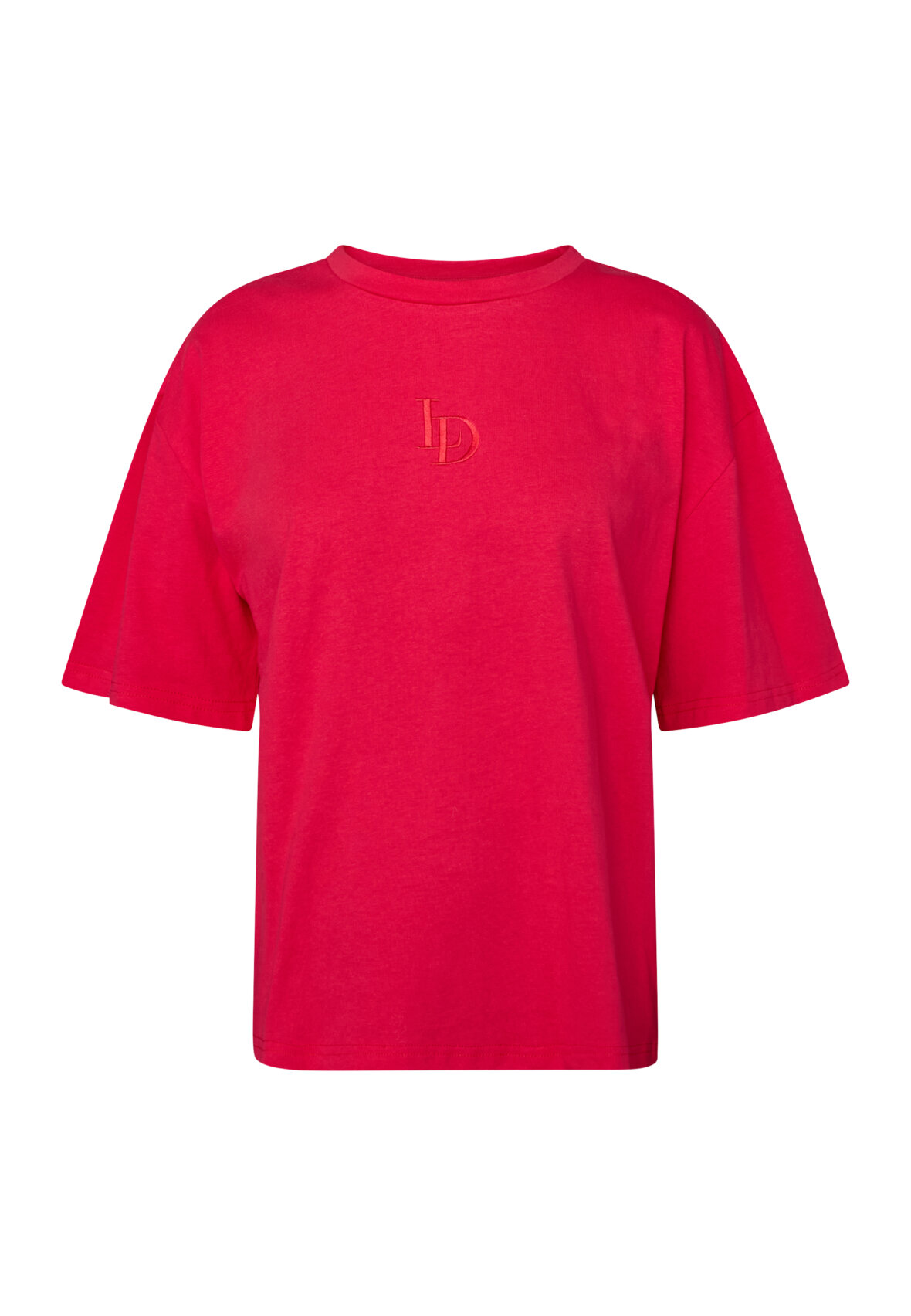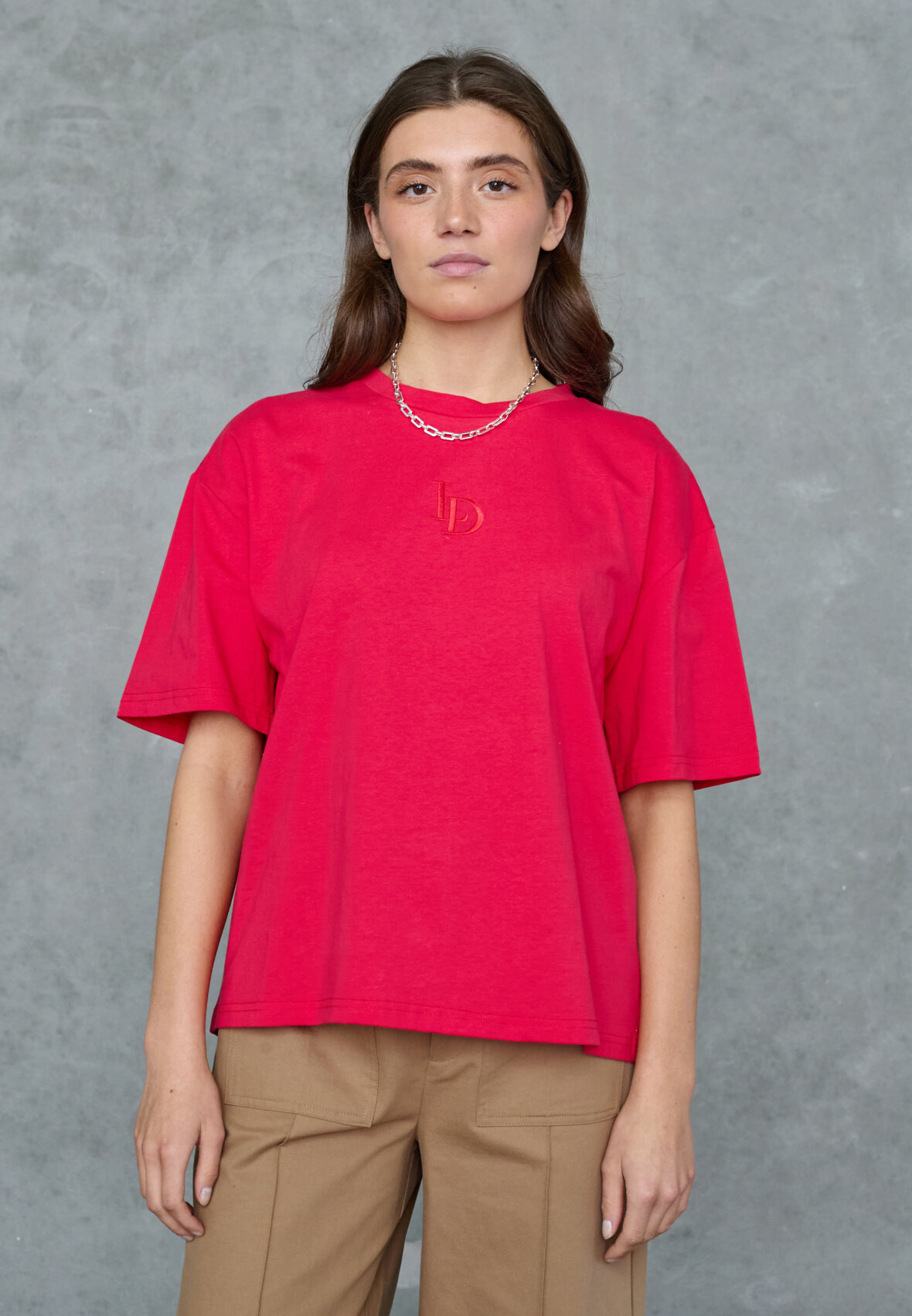 love1303-3 is an oversized t-shirt in heavy cotton with a relaxed boxy fit and drop shoulders. This must-have staple is adorned with a subtle, embroidered tone-in-tone logo on the chest. The model is wearing a size XS/S.