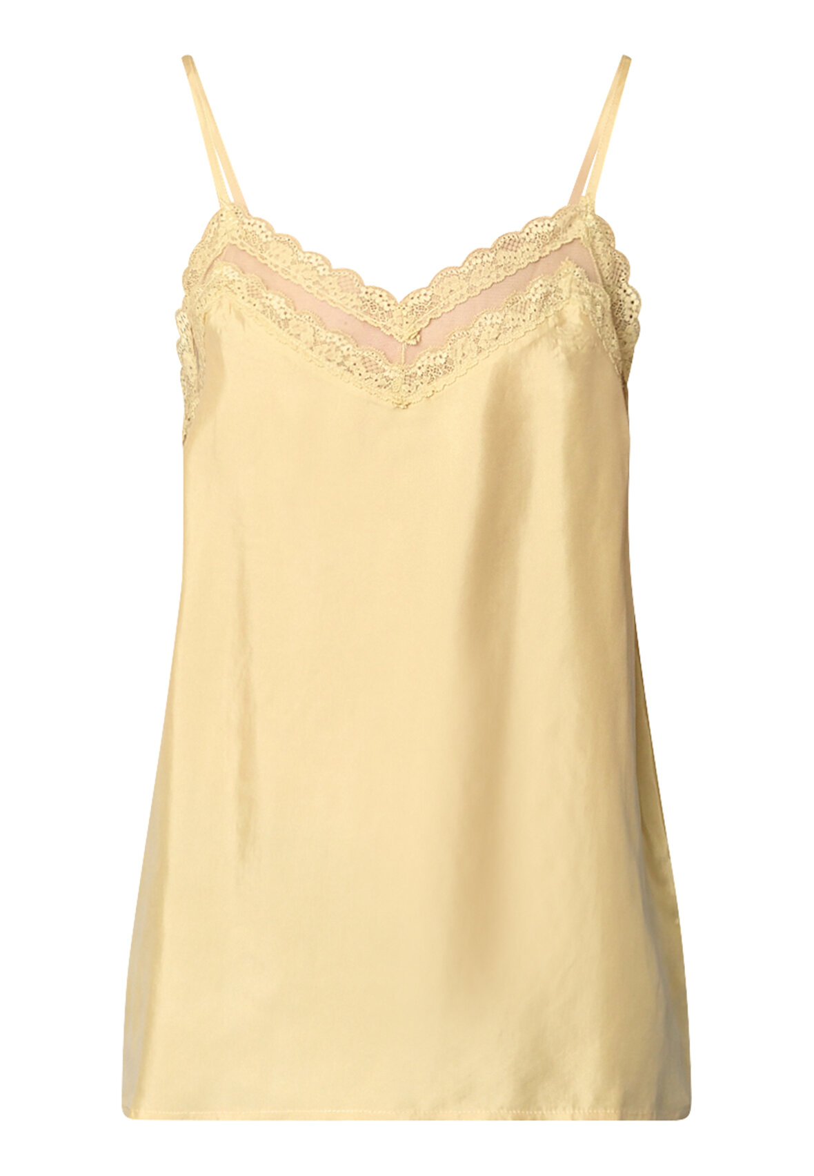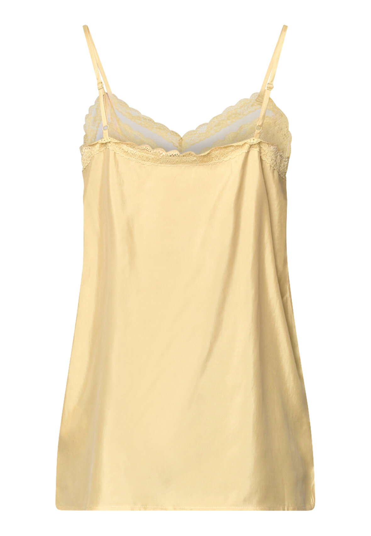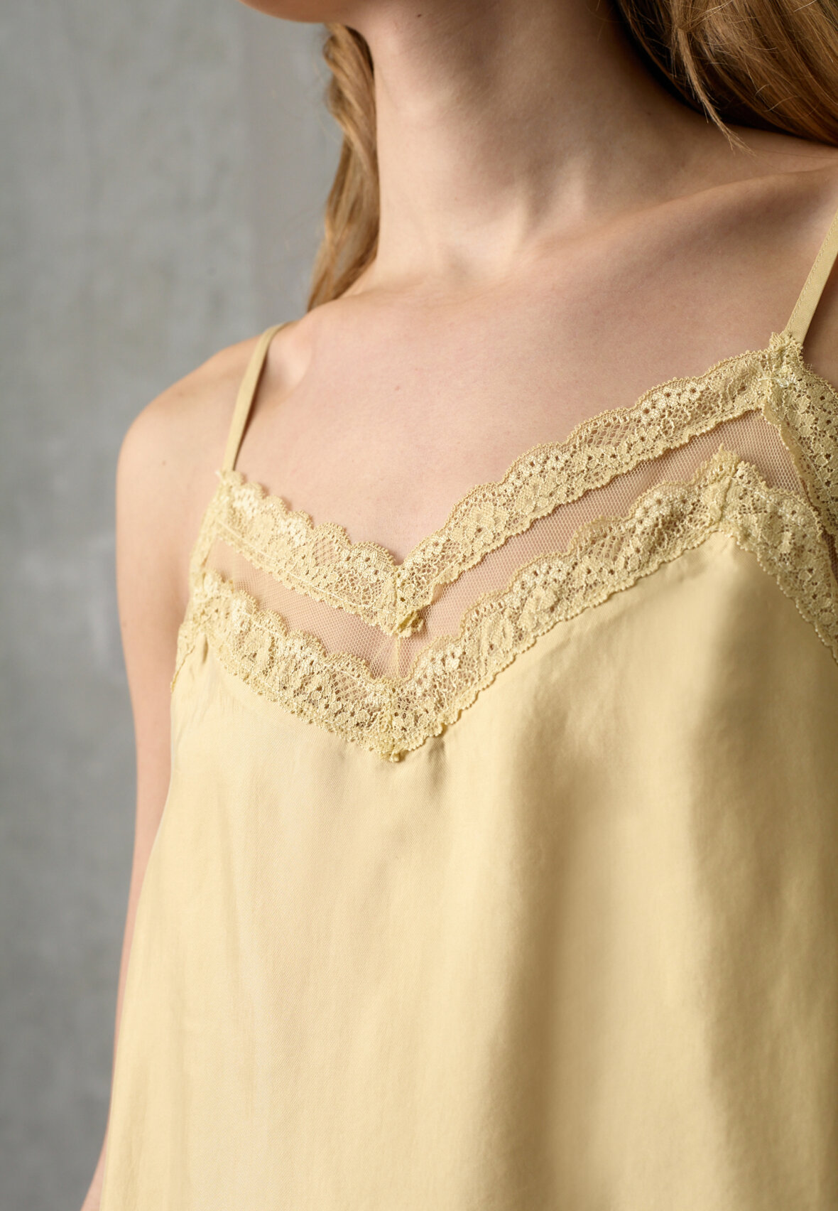 love1556 is an elegant top in a lightweight quality with a luxurious sheen. The top has fine, adjustable spaghetti straps and a feminine v-neck with delicate lace inserts and transparent details. The model is wearing a size S.