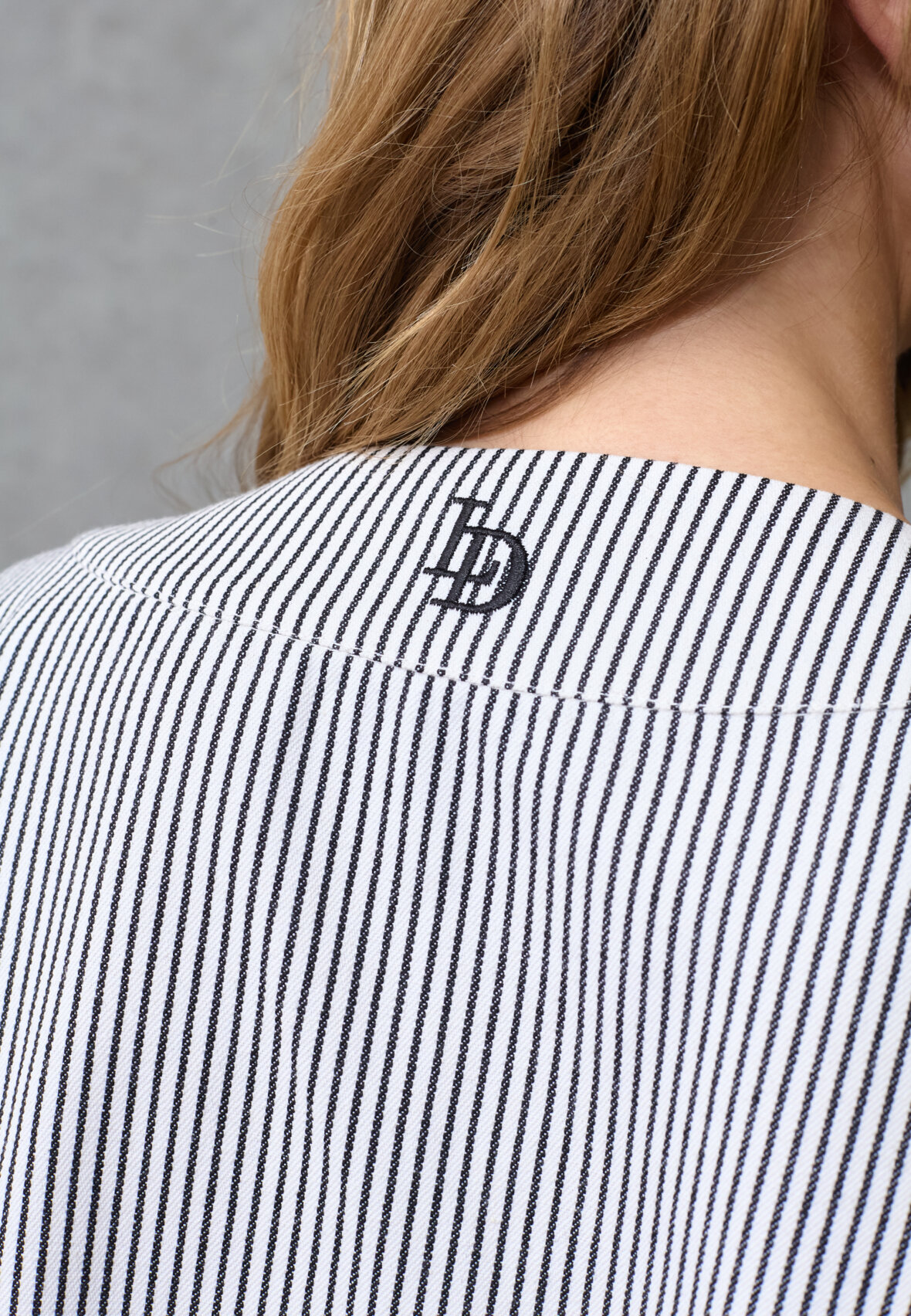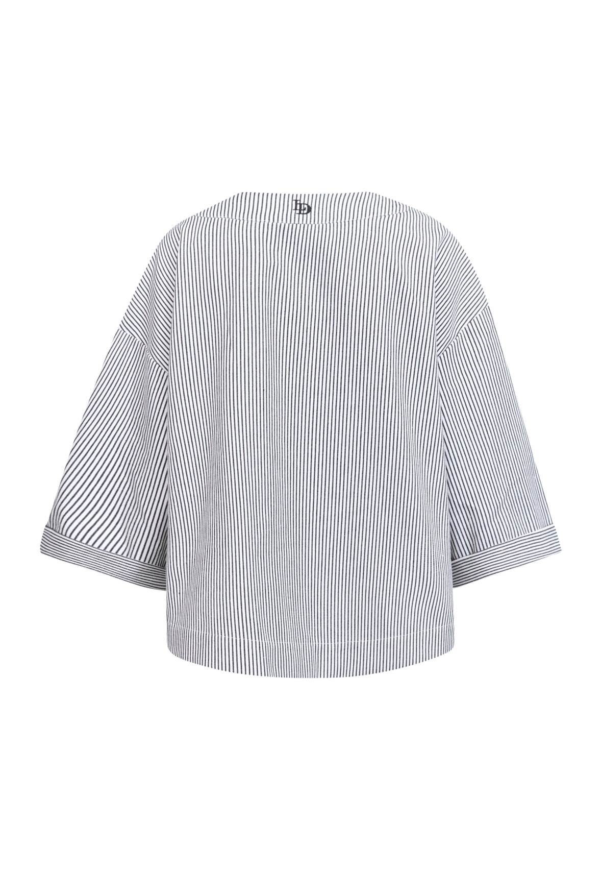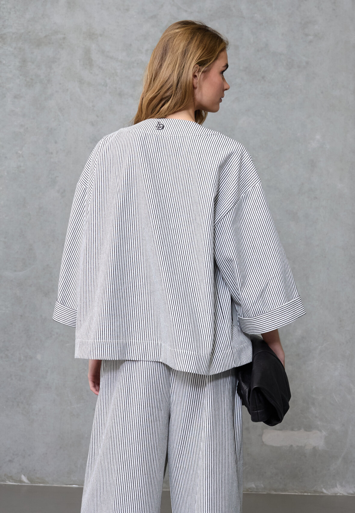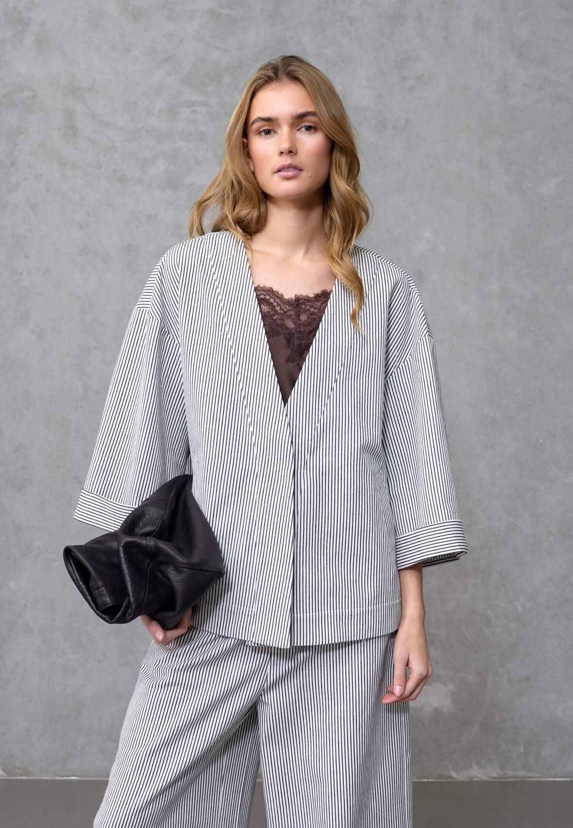 love1521 is a kimono-inspired cardigan. The top has 3/4 sleeves and an elegant V-neck, making it ideal for layering. It has a striped pattern and logo detail at the neck. The model is wearing a size XS/S.