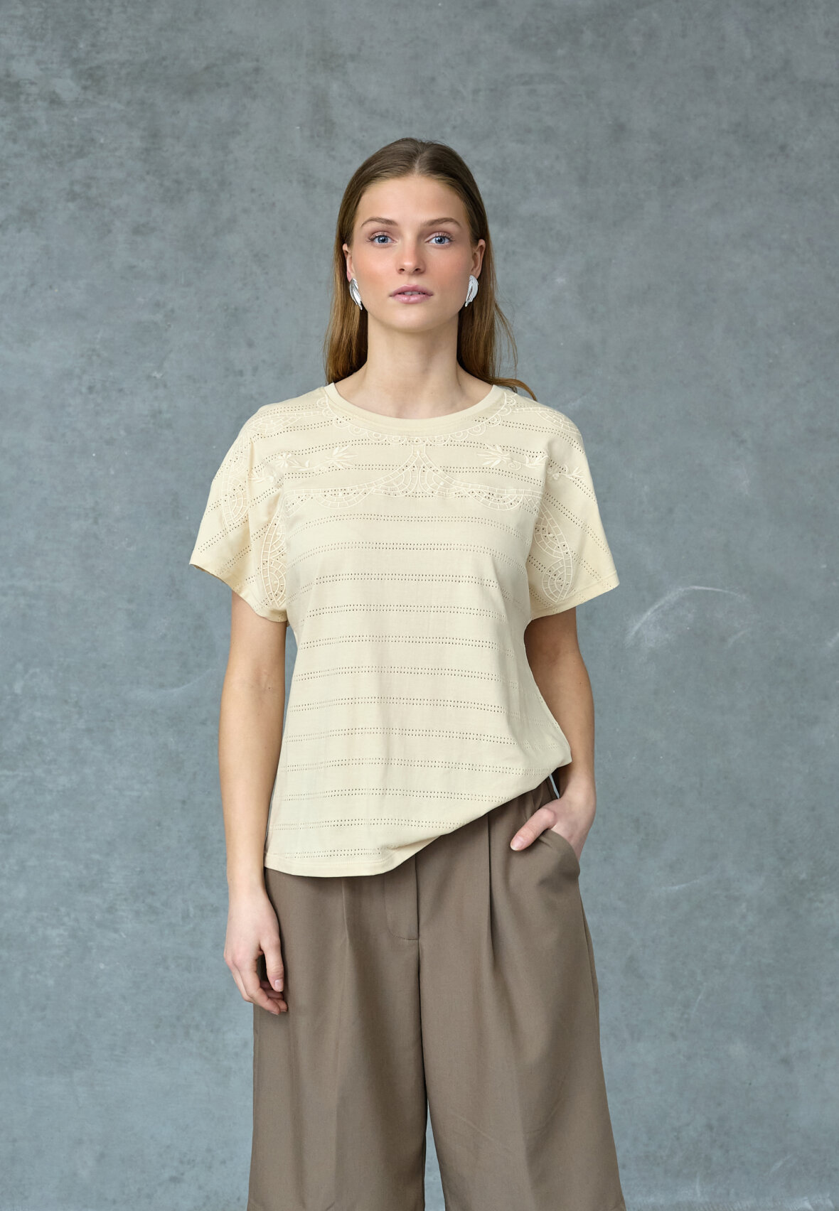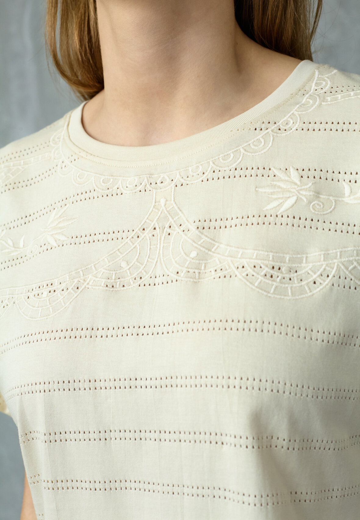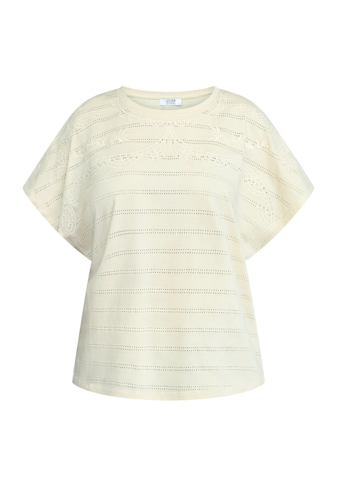 love1533 is a t-shirt in cotton quality with a relaxed fit. It has fine details with embroidery. The model is wearing a size S.