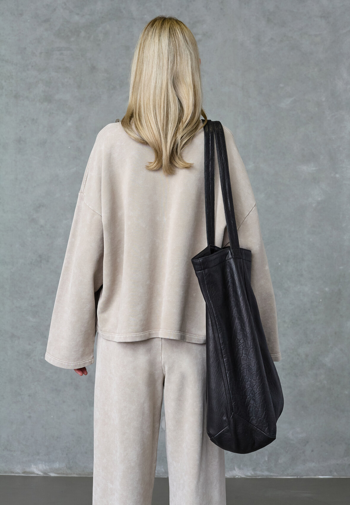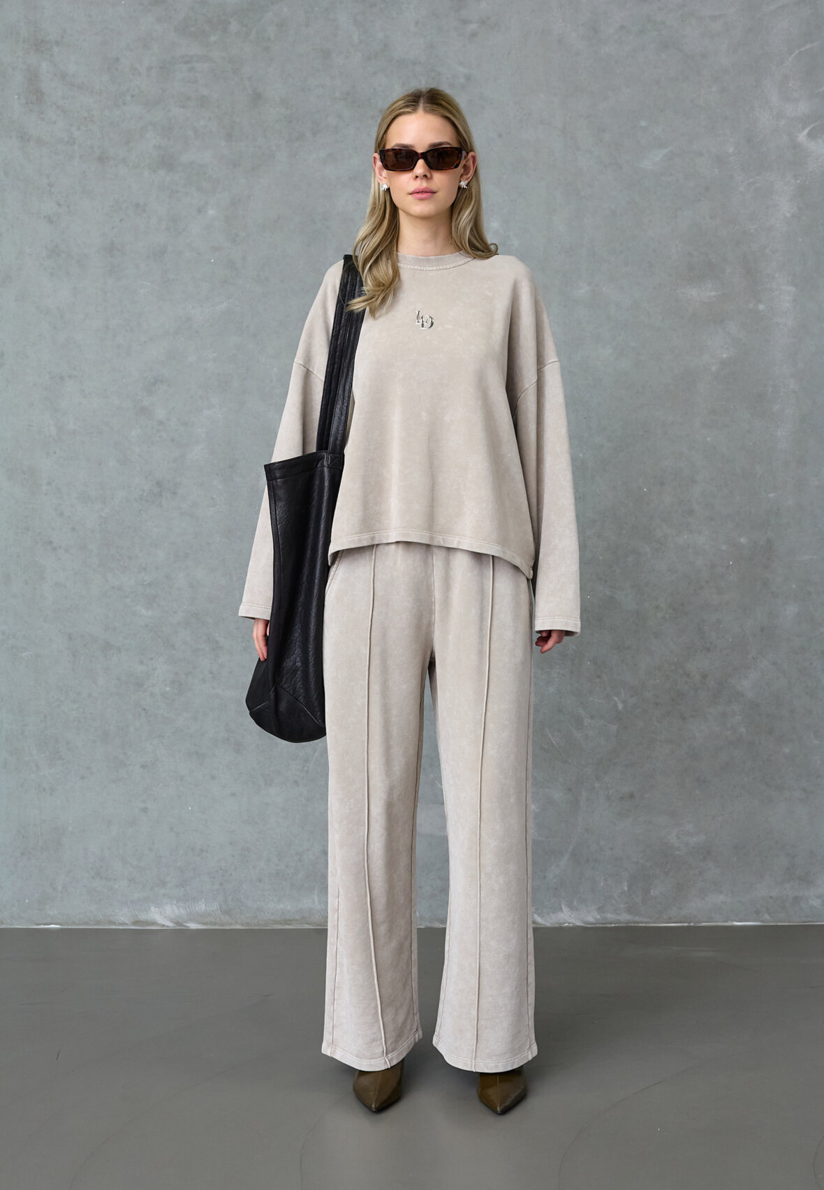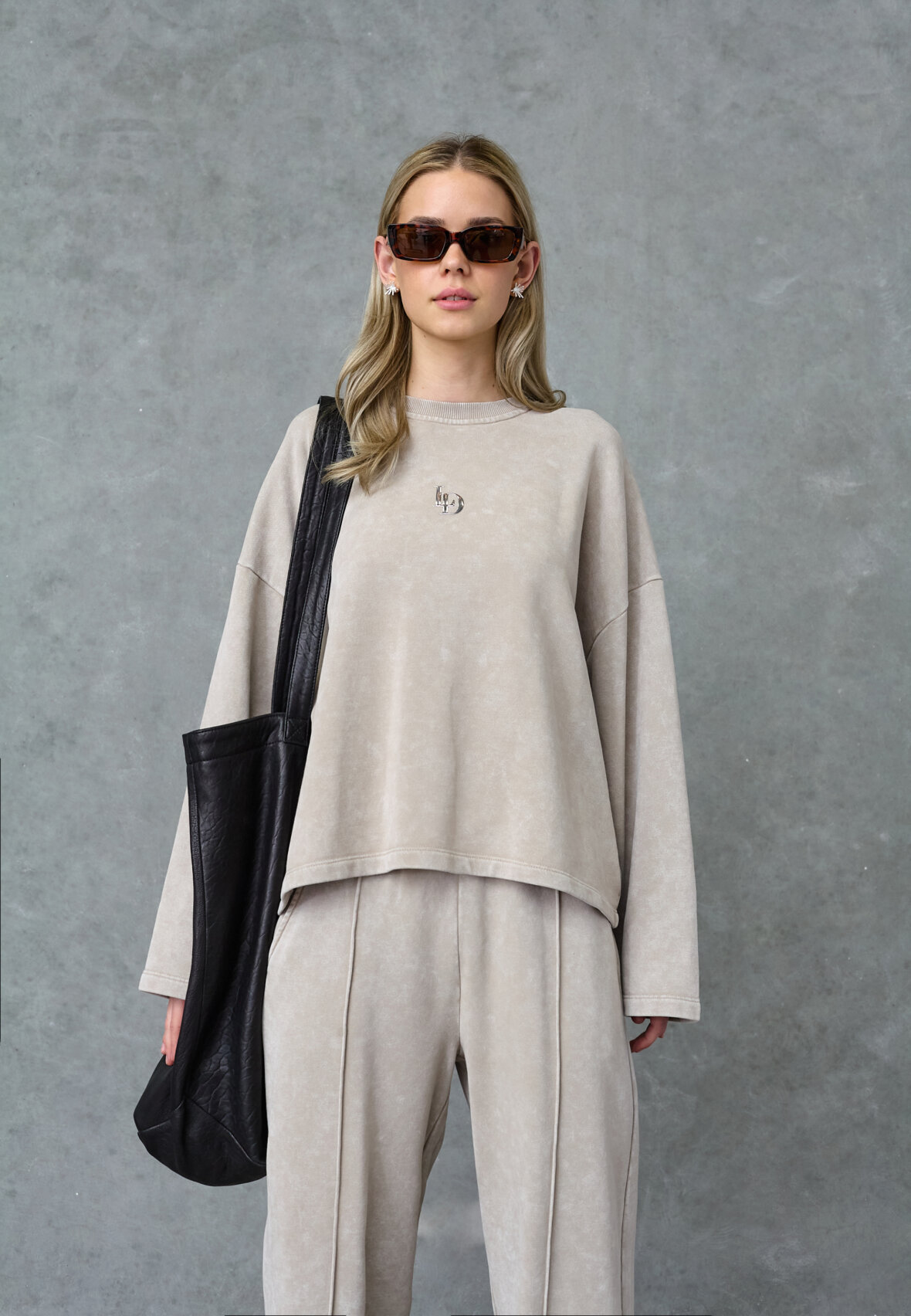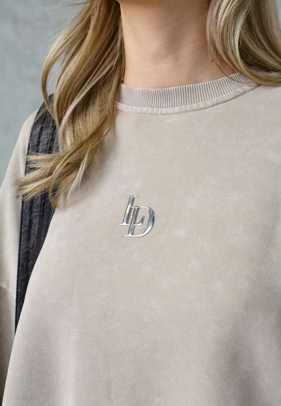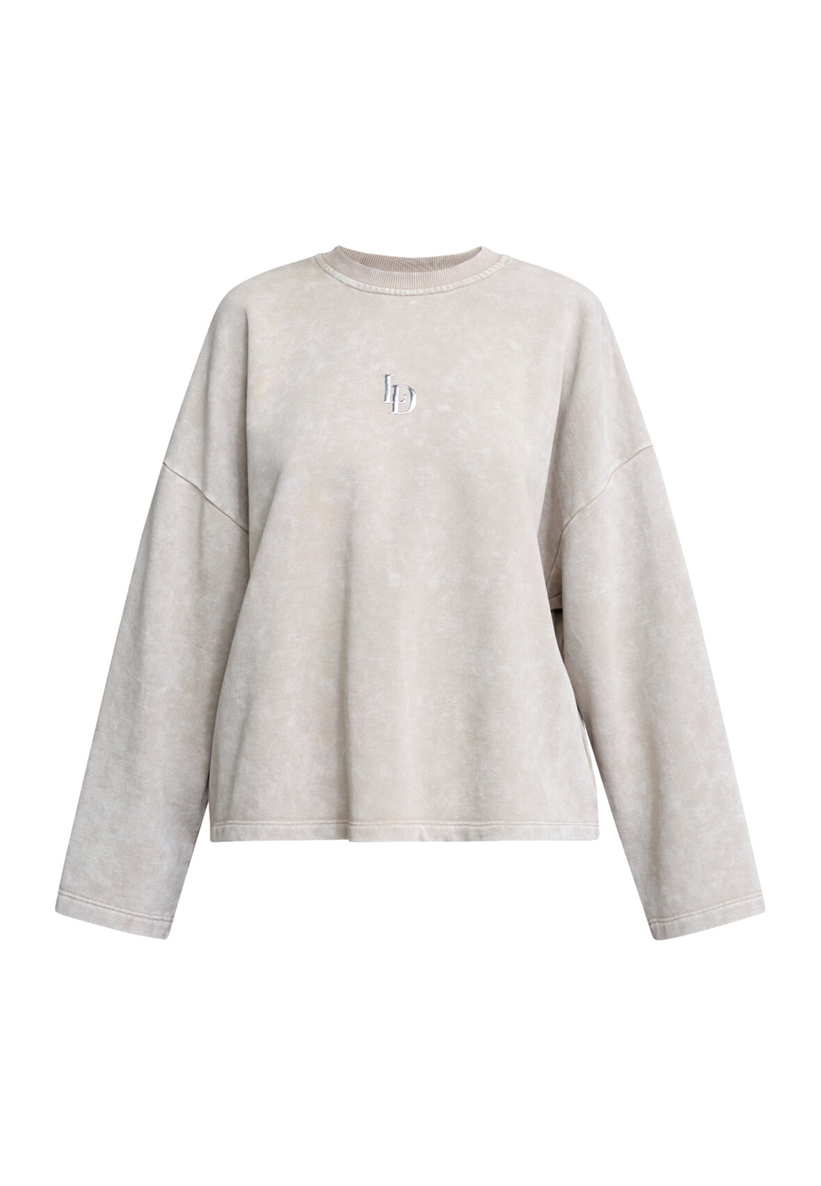 love1572 is an oversized sweatshirt in soft washed jersey with a relaxed box fit and drop shoulders. The design has a classic round neck with ribbed trim and a metal logo badge on the chest. The model is wearing a size S.