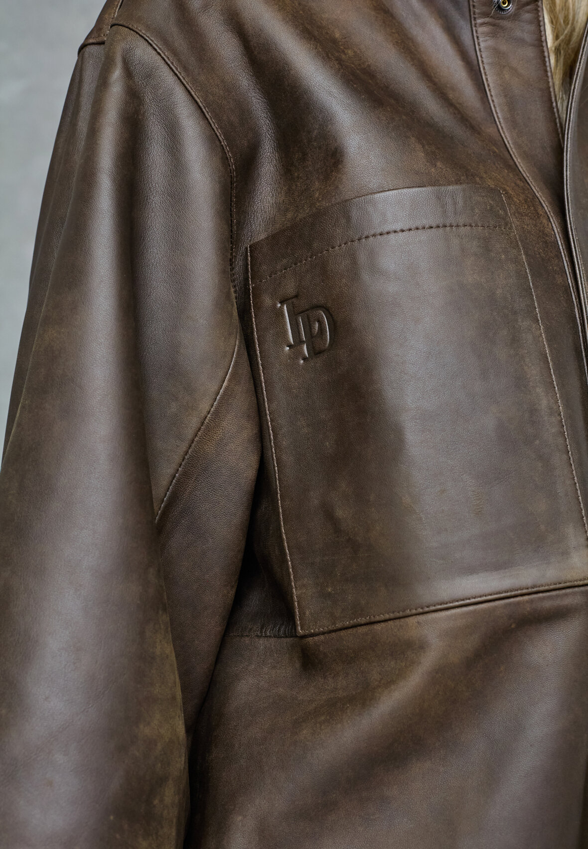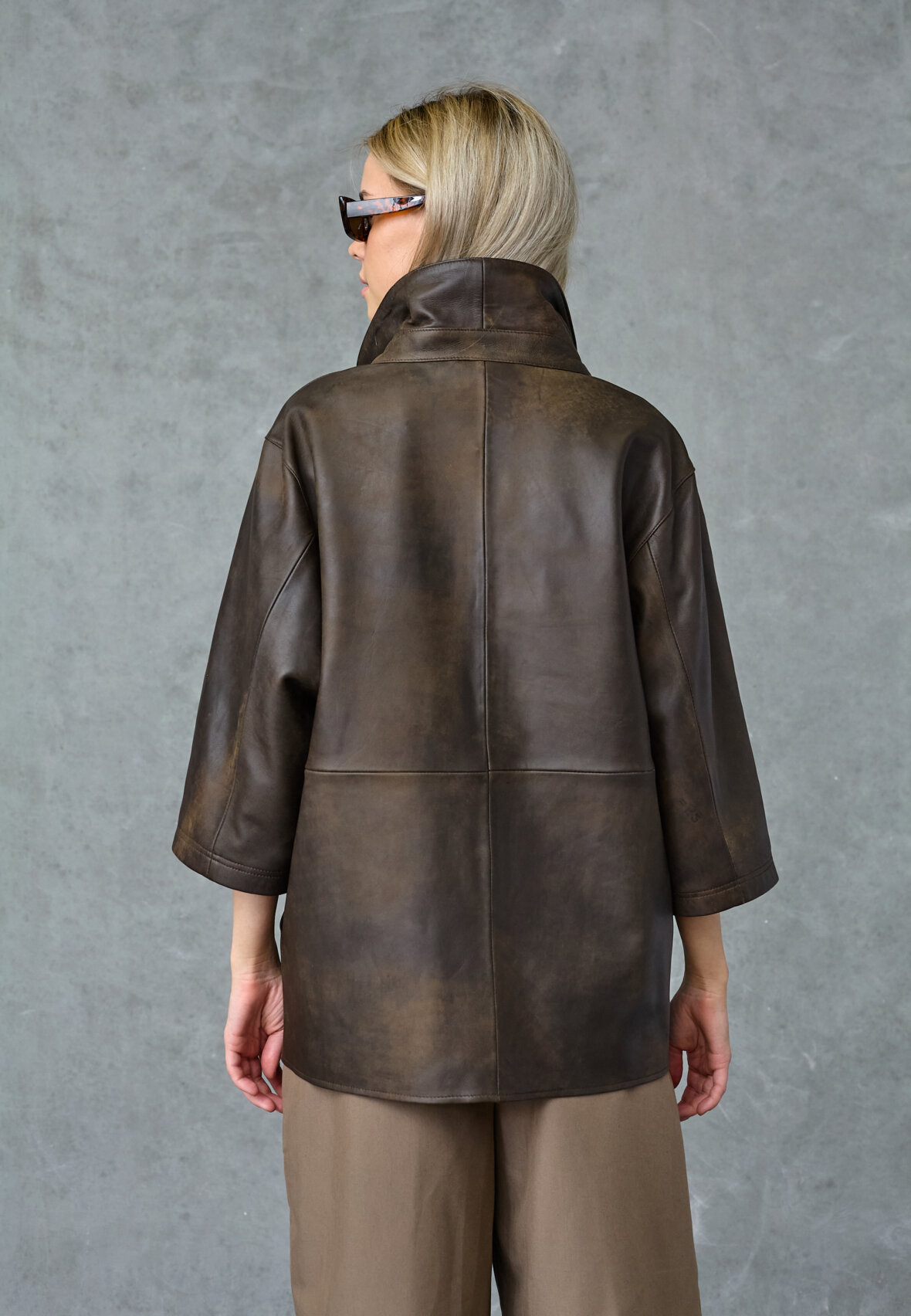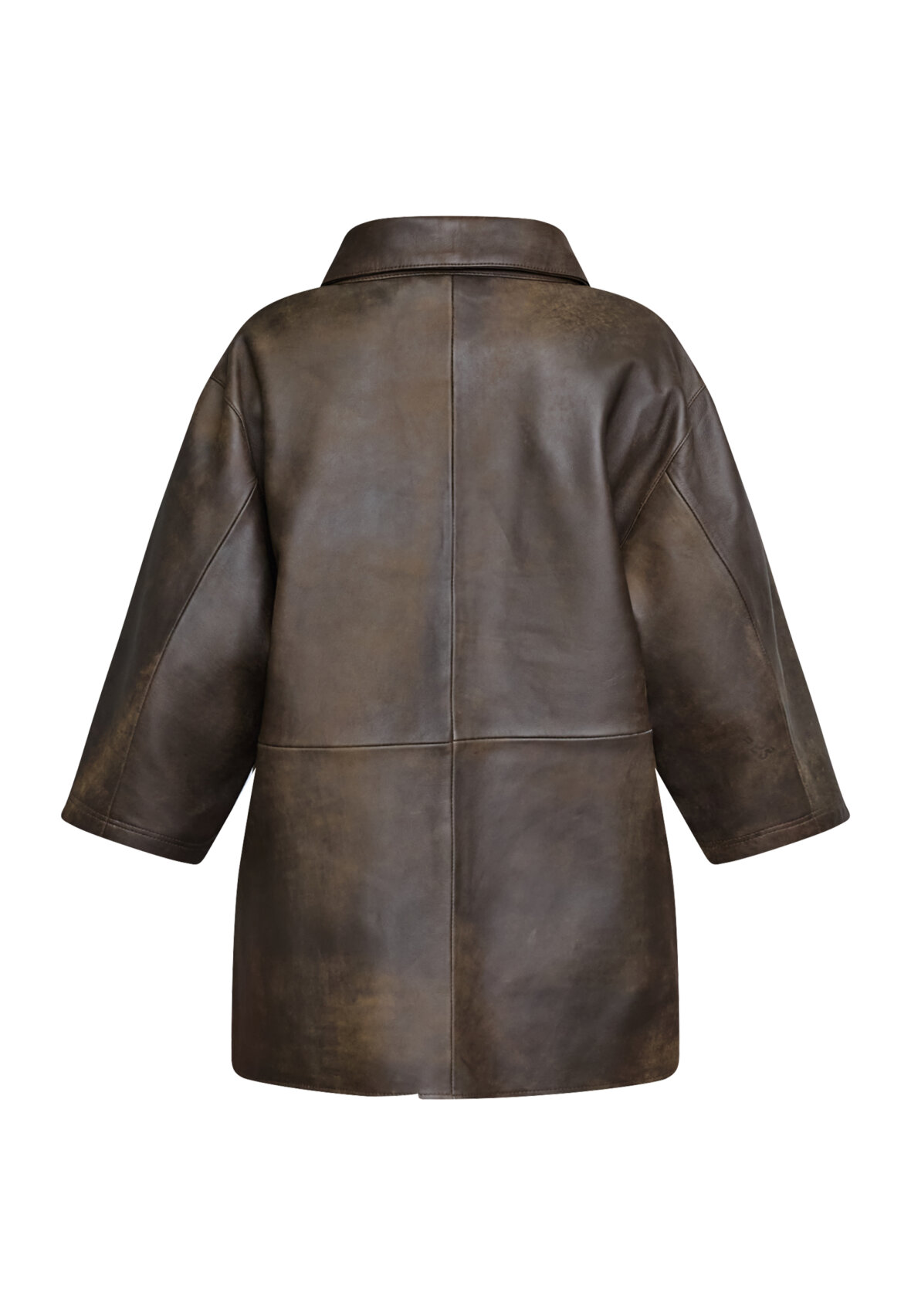 love1557 is an oversized leather jacket in quality leather with a vintage finish. The design has a boxy fit, hidden button closure and cropped sleeves as well as large front pockets with logo. The model is wearing a size S/M.