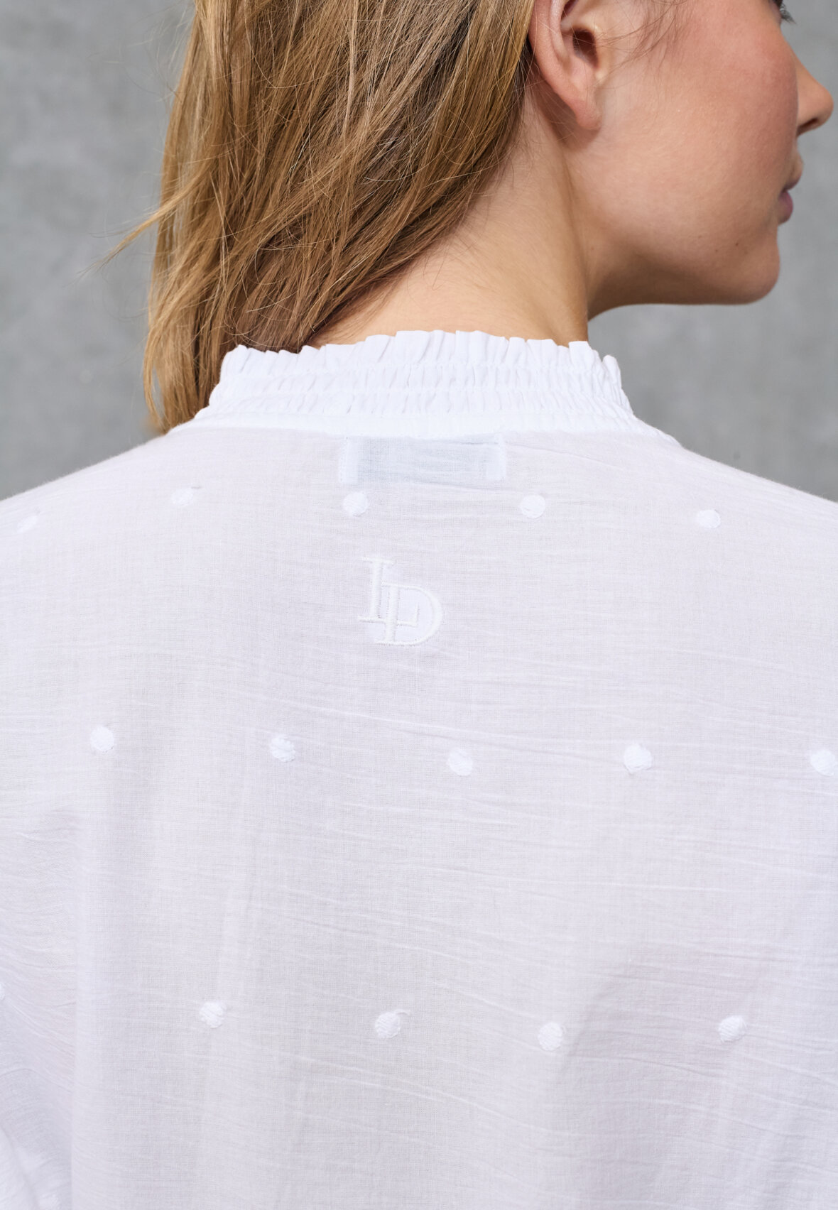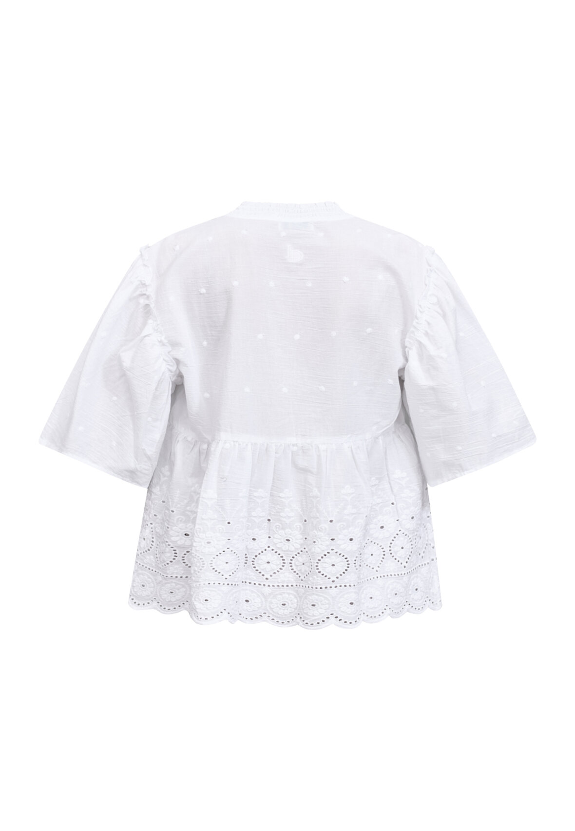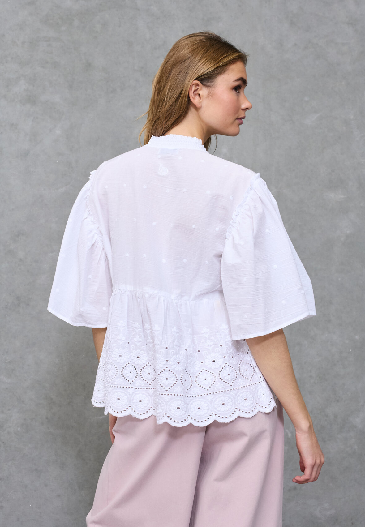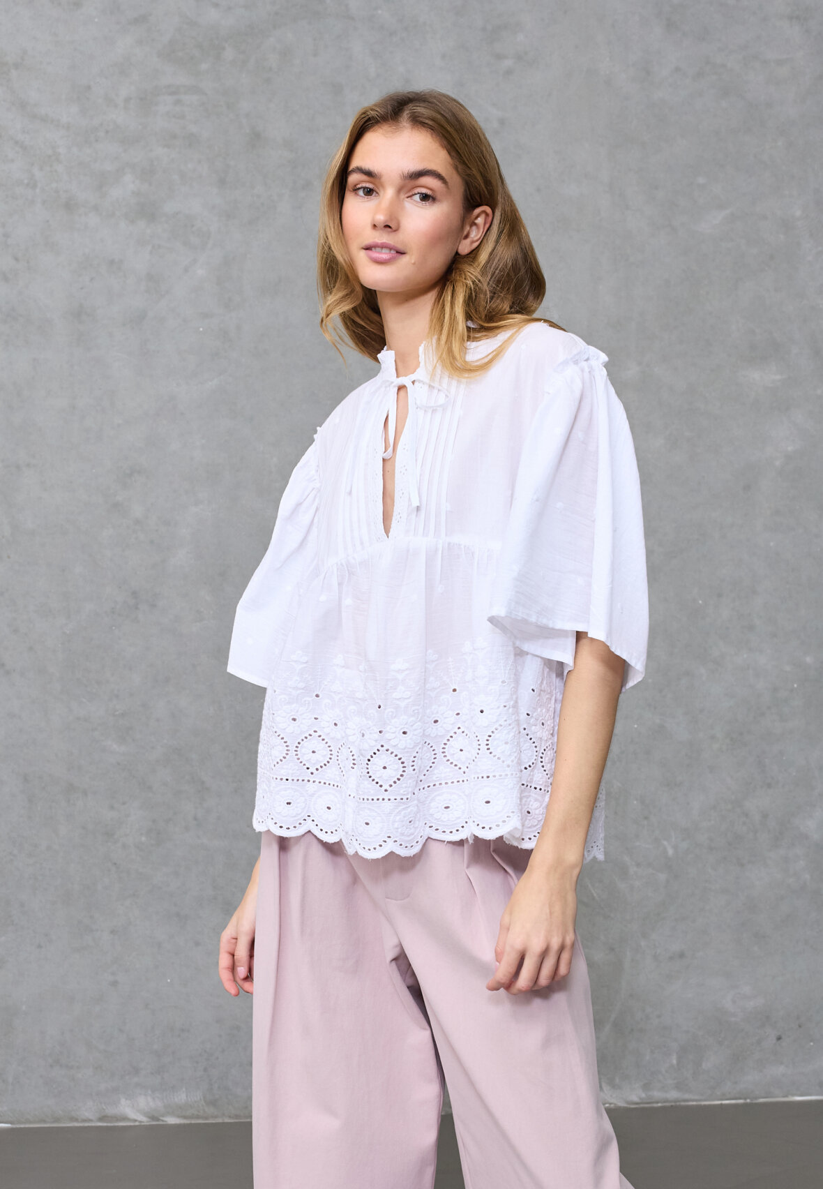 love1530 is a feminine bohemian blouse with beautiful broderie anglaise details and a romantic peplum silhouette. The blouse has puff sleeves, an elegant tie closure at the neck and fine pleats. The model is wearing a size S.
