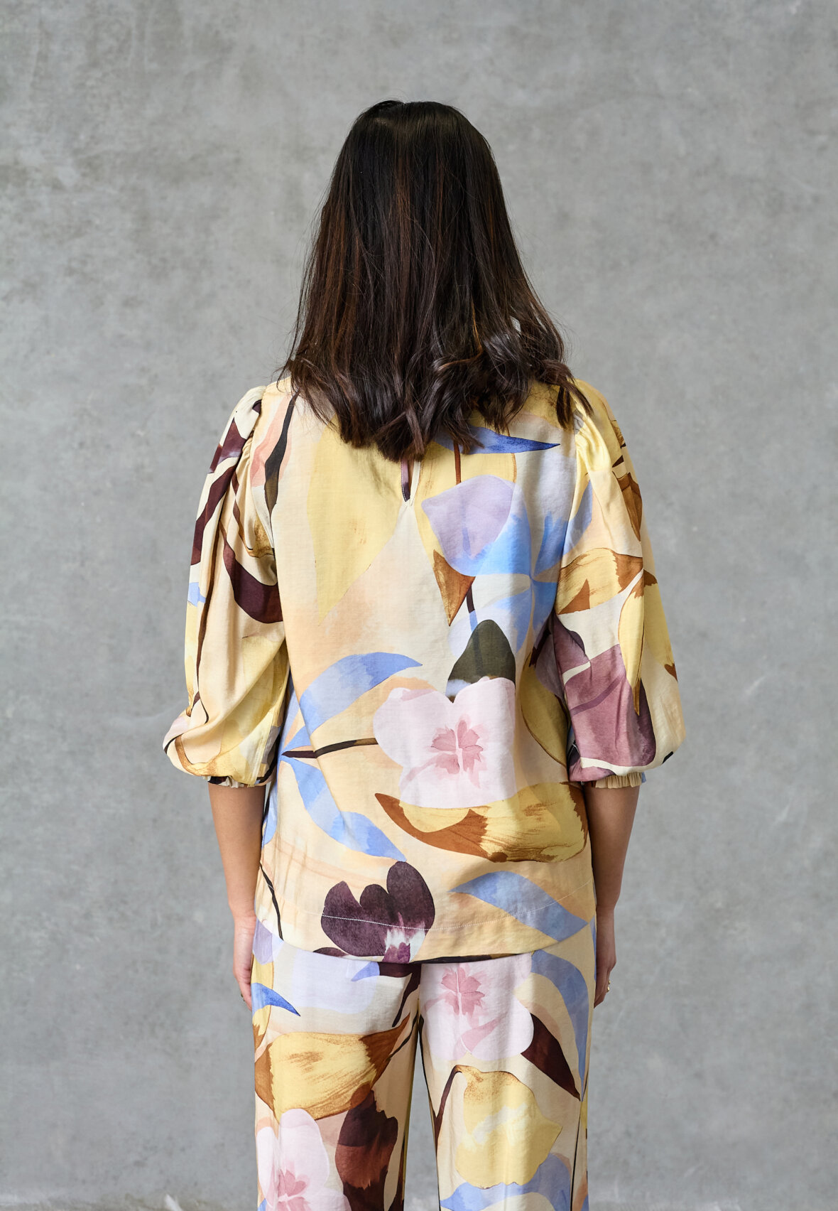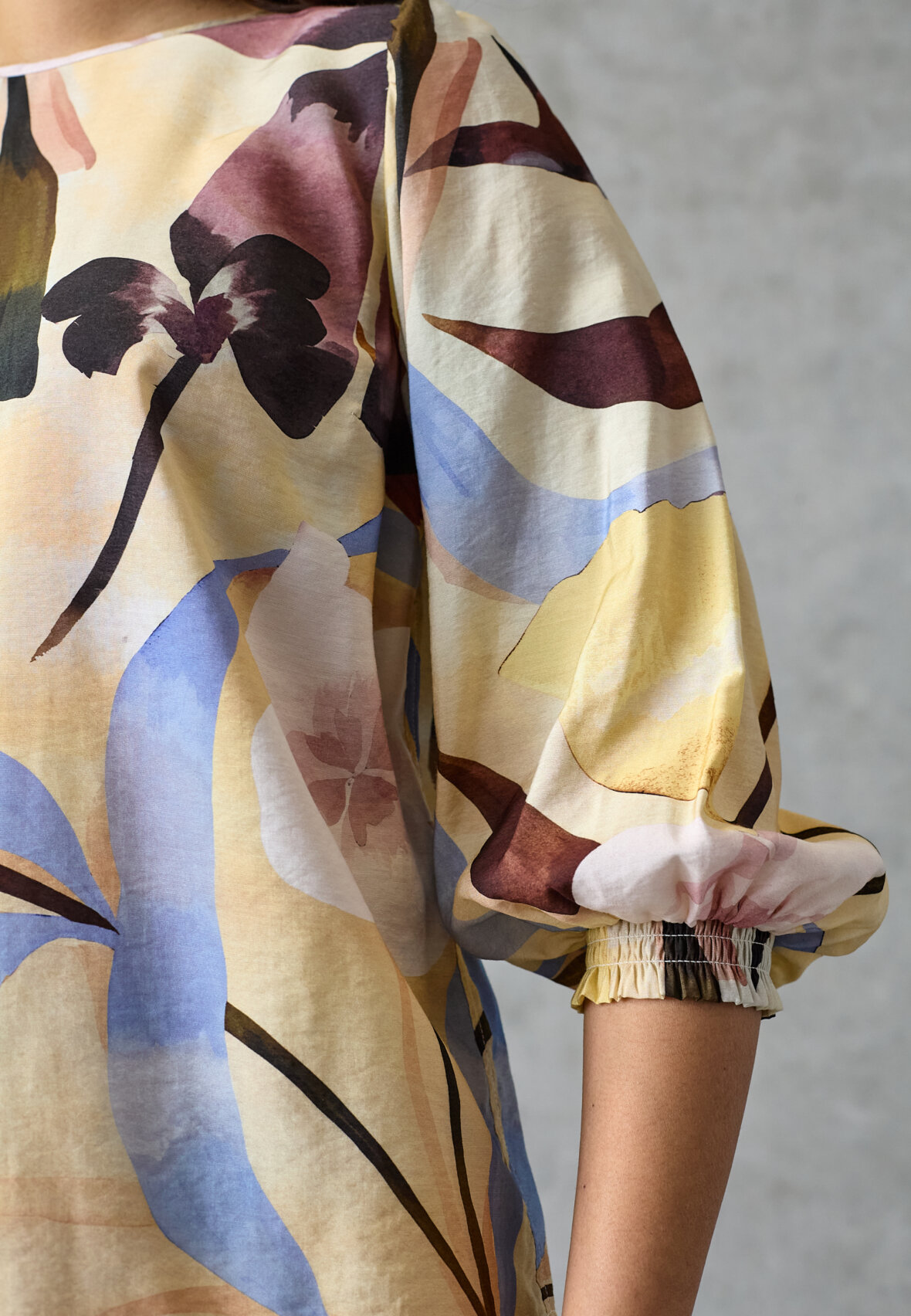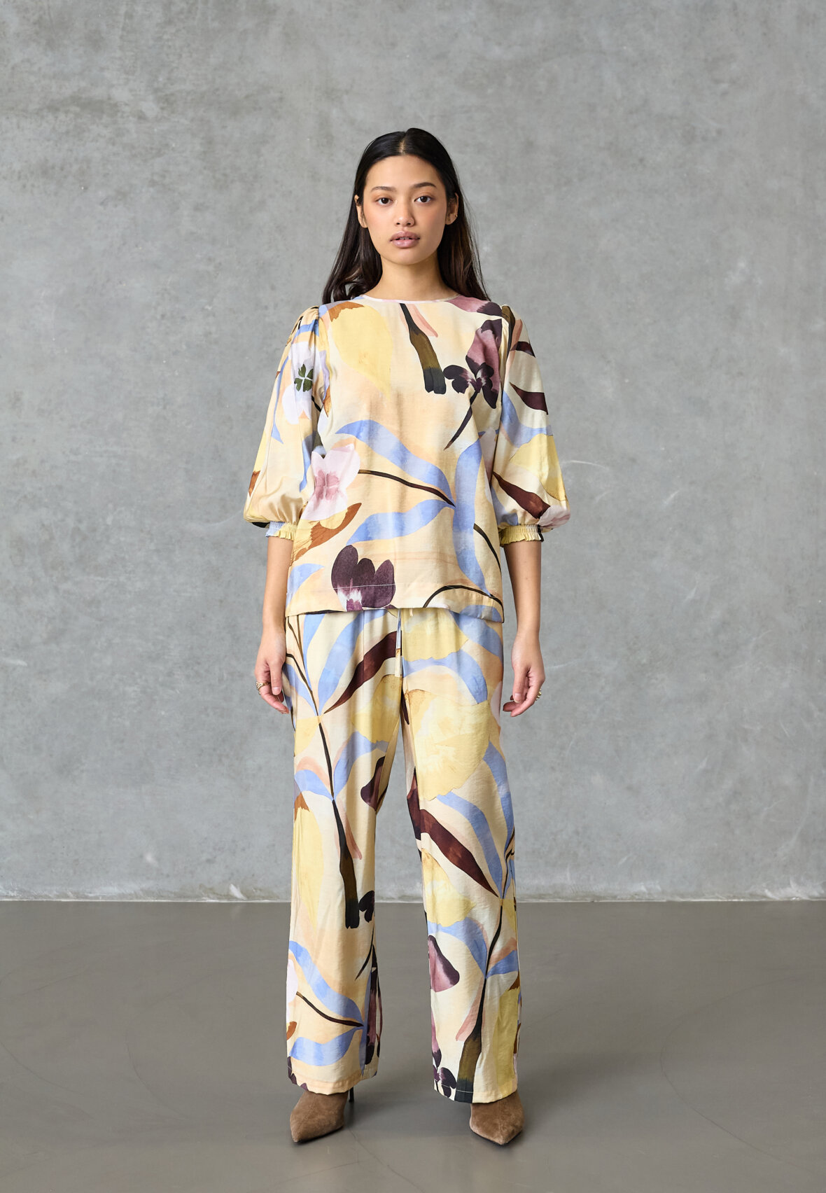 love1568 is a light blouse with a feminine print and short puff sleeves for an elegant look. The model is wearing a size S.