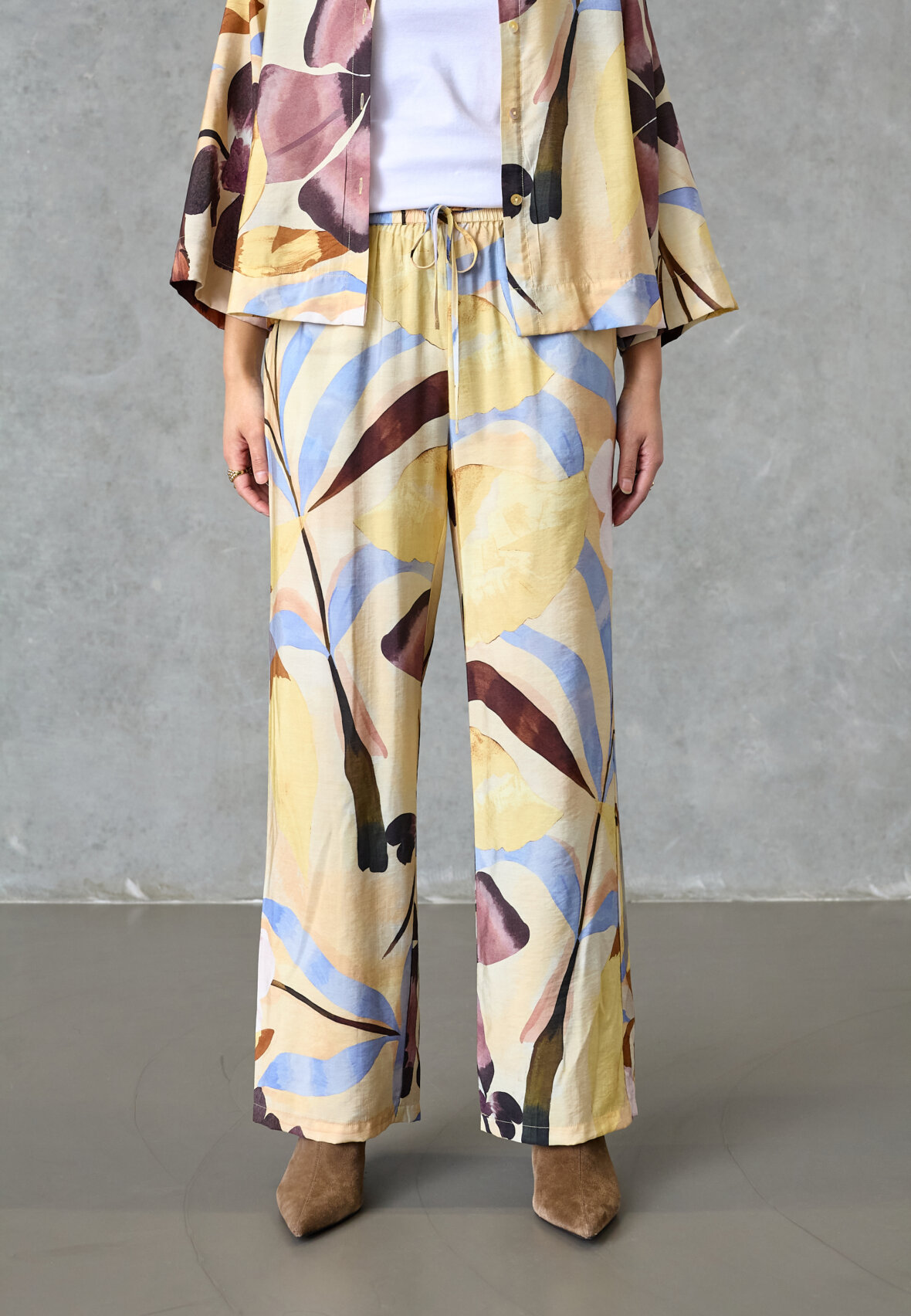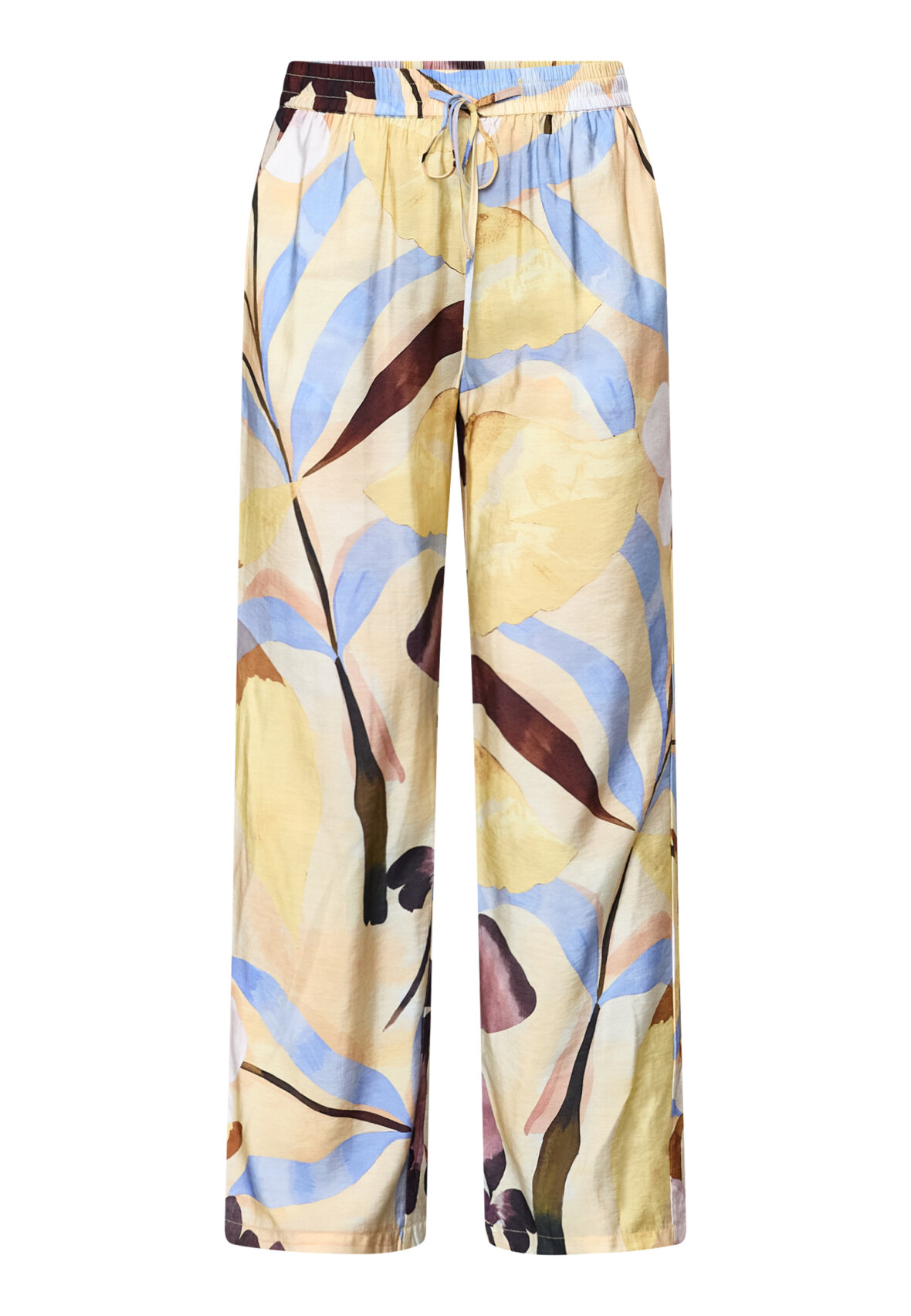 love207-45 are a pair of wide-leg trousers in a lightweight quality with a beautiful graphic print. The trousers have a relaxed fit with elastic at the waist and functional tie. The model is wearing a size S