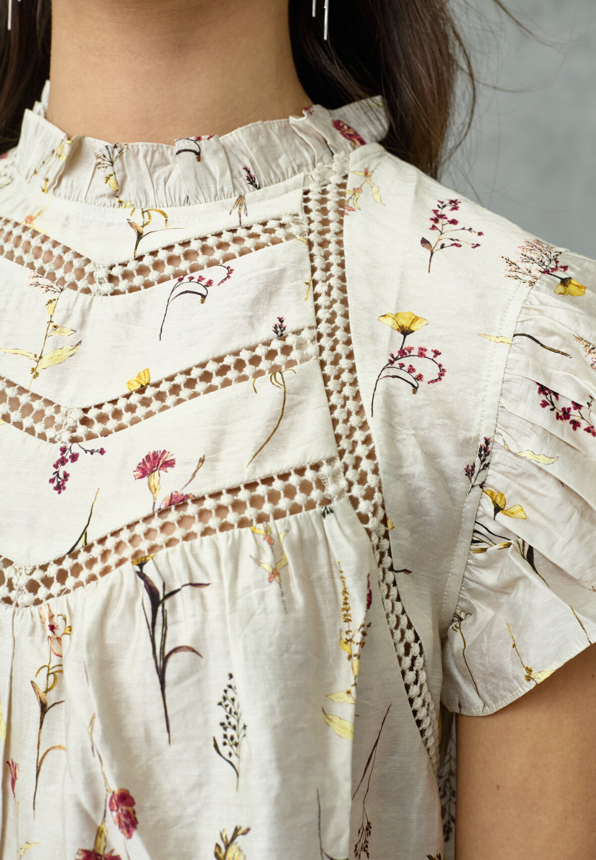 love1374-1 is a feminine blouse with short ruffle sleeves. The blouse has a high, gathered neckline and decorative V-shaped embroidery on the front. It has a beautiful flower pattern. The model is wearing a size S.